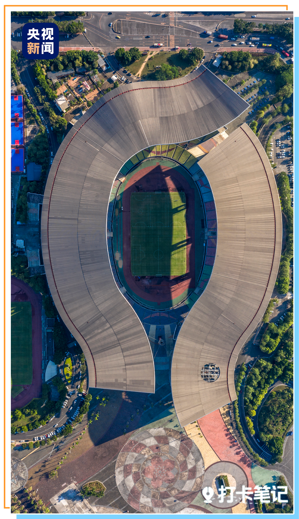 经过升级改造后的广东奥体中心体育场,新造型也很有看点:设计灵感来自“珠水奔流、湾区浪涌”。屋顶像飘带,看台像木棉,广场景观像珠江翻涌的波浪~整体呈现海蓝色调,很有大湾区的氛围感!