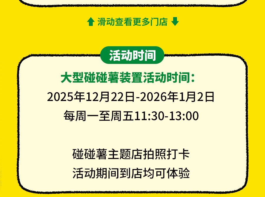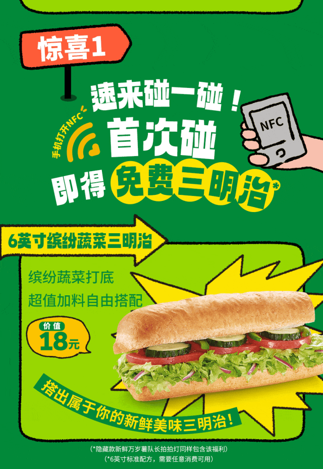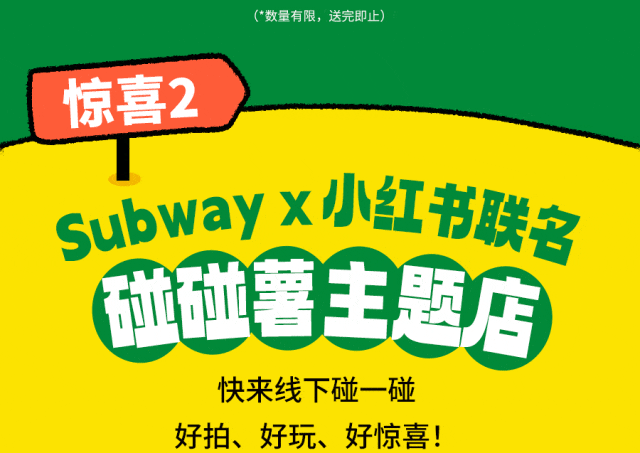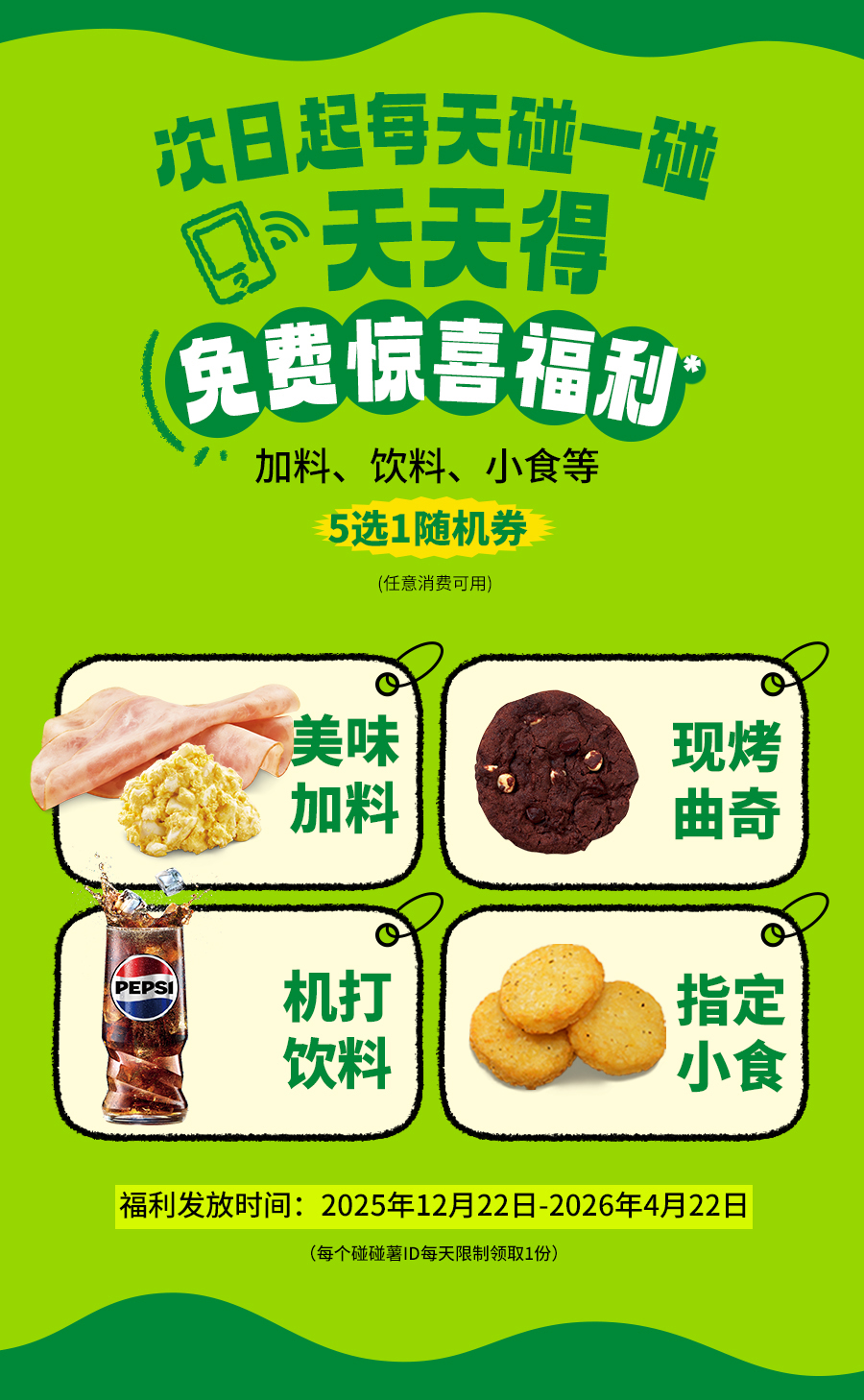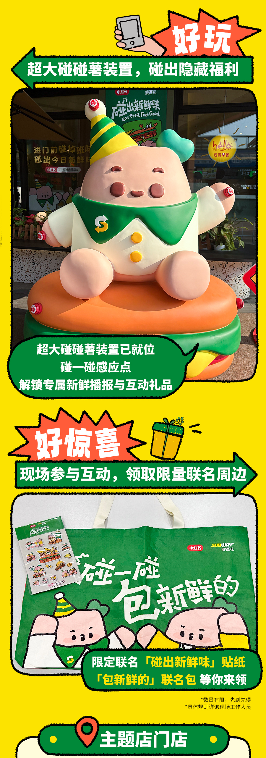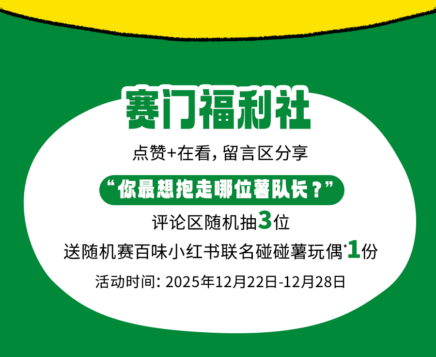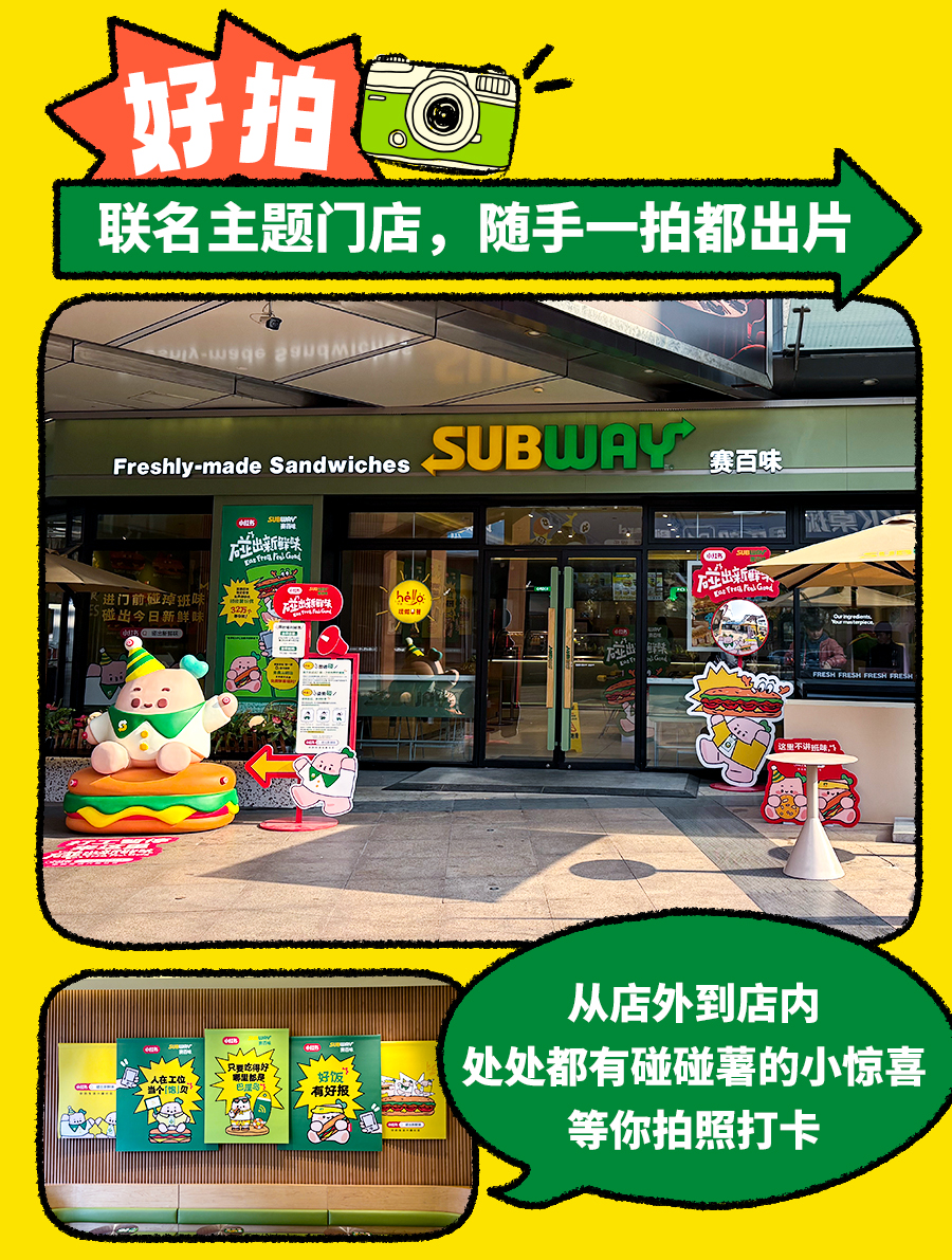 上述活动限2025年12月22日起于SUBWAY®赛百味中国大陆地区部分餐厅供应,机场、火车站等交通枢纽餐厅、旅游景区餐厅、园区内部餐厅等特殊餐厅除外,具体以餐厅公示为准。产品、周边以实物为准,以上为创意图片,仅供参考。活动期间,购买指定套餐可免费加购赛百味小红书联名碰碰薯玩偶1份(下称“碰碰薯”,该活动机制仅适用于赛百味支付宝小程序,赛百味微信小程序及线下门店柜台点单,不适用于第三方外卖平台、大众点评、抖音等其他网上订餐渠道)。指定套餐含早餐套餐、能量碗套餐、三明治/百味卷三/四件套、健盈卡三明治二件套、儿童餐、多人餐(下午茶套餐、三明治/百味卷二件套、eteecy联名套餐等除外,具体详见小程序菜单);碰碰薯全国共限量32万份,数量有限,发完即止。碰碰薯共3款(好饭有好报薯队长挂件玩偶、工位饱贝薯队长摆件玩偶、吃得好薯队长摆件玩偶),随机发放,当日款式以餐厅实际供应为准。免费三明治指首次碰可领取“0元赛百味6英寸标准配方缤纷蔬菜三明治”电子优惠券1张,免费福利指次日起每日碰可领取0元惊喜券1张,凭券可免费兑换小食、饮品、曲奇等。每个碰碰薯每日仅可领取一份福利,单日不可重复领取。福利优惠券的具体有效期、使用规则等请查看券面说明。碰碰薯的具体权益领取规则详见赛百味微信公众号菜单栏 - 新鲜放送 - 联名碰碰薯活动,SUBWAY赛百味可以在法律允许的范围内对活动进行适当调整。Subway® is a Registered Trademark of Subway IP LLC © 2025 Subway IP LLC.