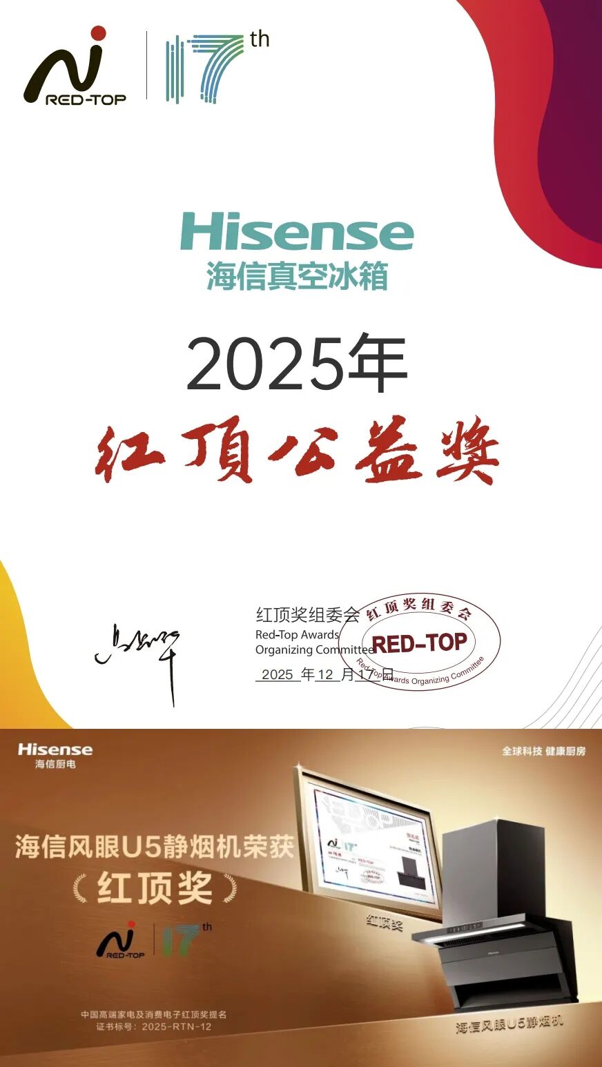 12月17日,以“耀•不凡 不一样的红顶奖”为主题的第17届中国高端家电趋势发布暨红顶奖颁奖盛典在北京圆满落幕。海信家电旗下的海信冰箱凭借在公益助学领域的长期深耕与持续贡献,第11次荣膺红顶公益奖,海信厨电风眼U5静烟机入选红顶奖提名产品名单,展现了在高端家电领域的科技创新实力。