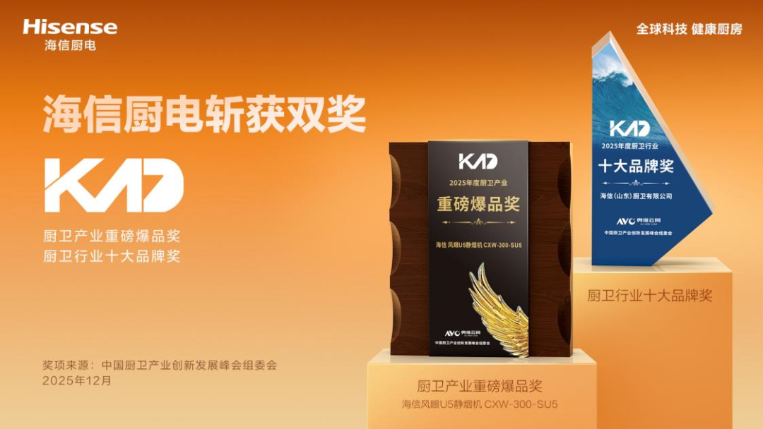 12月18日,以“赢销进化 值达用户”为主题的第七届中国厨卫产业创新发展峰会在南京隆重召开,现场揭晓了年度权威奖项。海信厨电凭借品牌影响力荣膺“2025年度厨卫行业十大品牌奖”,旗下产品海信风眼U5静烟机凭借颠覆性的静音科技,同步斩获“2025年度厨卫产业重磅爆品奖”。