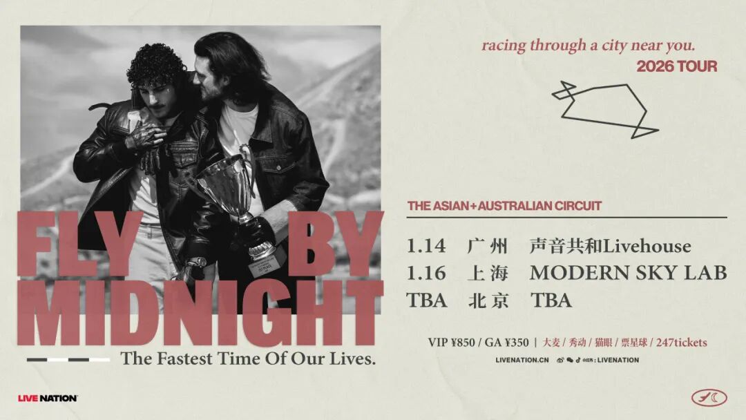 本轮巡演将横跨十一座城市,其中包括东京、首尔、新加坡、广州、北京、上海等地。Fly By Midnight以电影般的现场演出和与观众的深度互动而著称,巡演将以他们7月11日通过STEM发行的全新作品《Fastest Times of Our Lives》为主题。此前他们已在亚洲多地举办过多场售罄演出,这趟旅程也将延续乐队在全球的上升势头。现场乐迷将有机会同时欣赏到新歌与人气单曲,见证他们的音乐成长,同时感受始终贯穿在他们音乐作品中的怀旧能量。