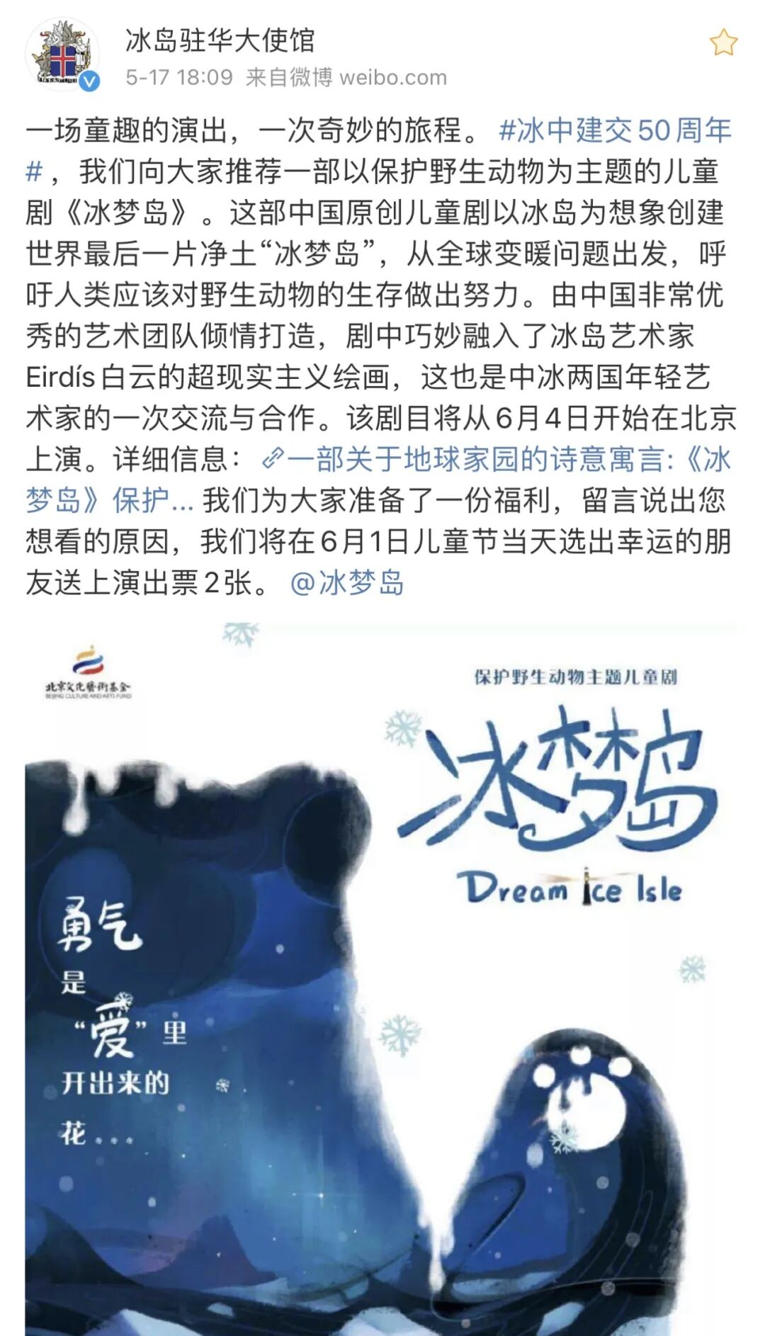 《冰梦岛》以其立足全球生态视野的保护野生动物公益主题,获得了国际爱护动物基金会(IFAW)的合作支持,为该剧提供野生动物保护领域的专业指导,该剧将在首演期间提供一场公益性演出,当天所有票房收入将用于野生动物救助和保护工作。