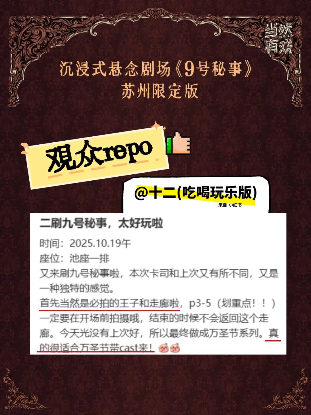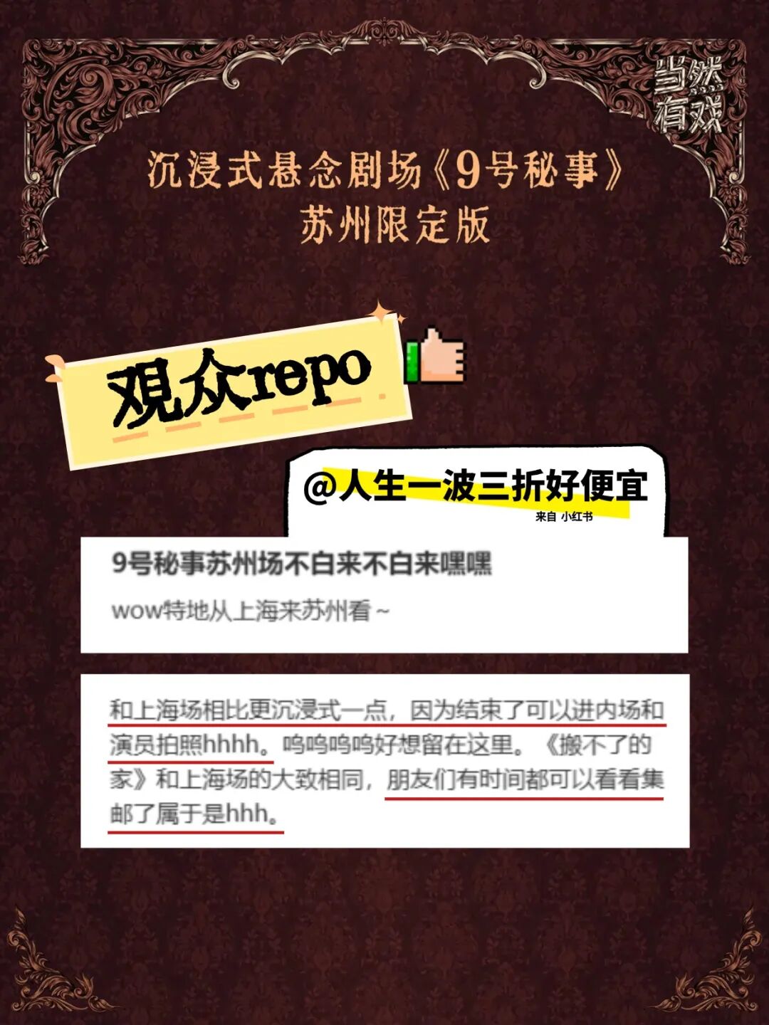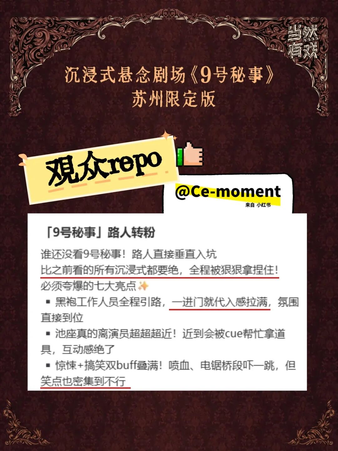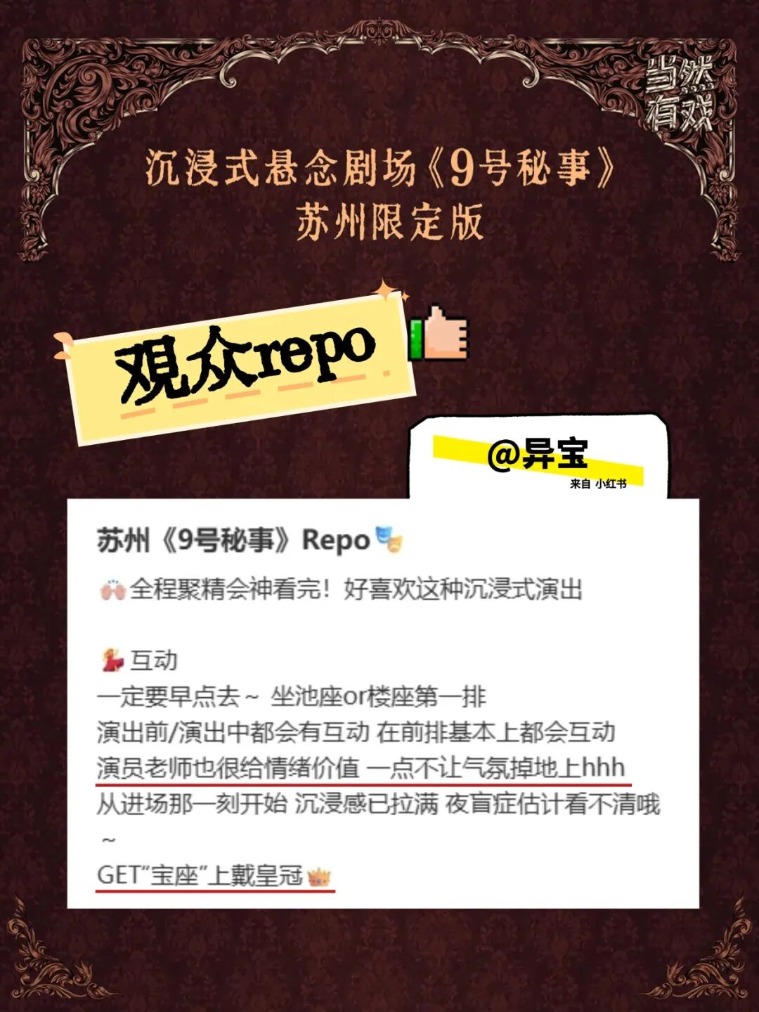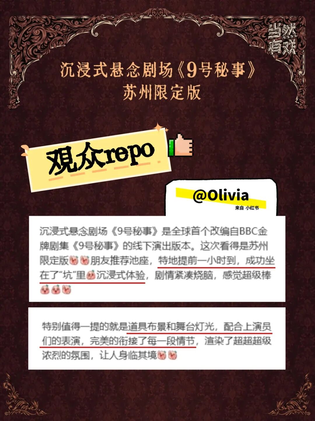 此外,发布优质小红书笔记,带话题 #9号秘事剧场# ,并 @苏州狮山大剧院,还有机会获得一张沉浸式剧场《9号秘事》演员亲笔签名海报。