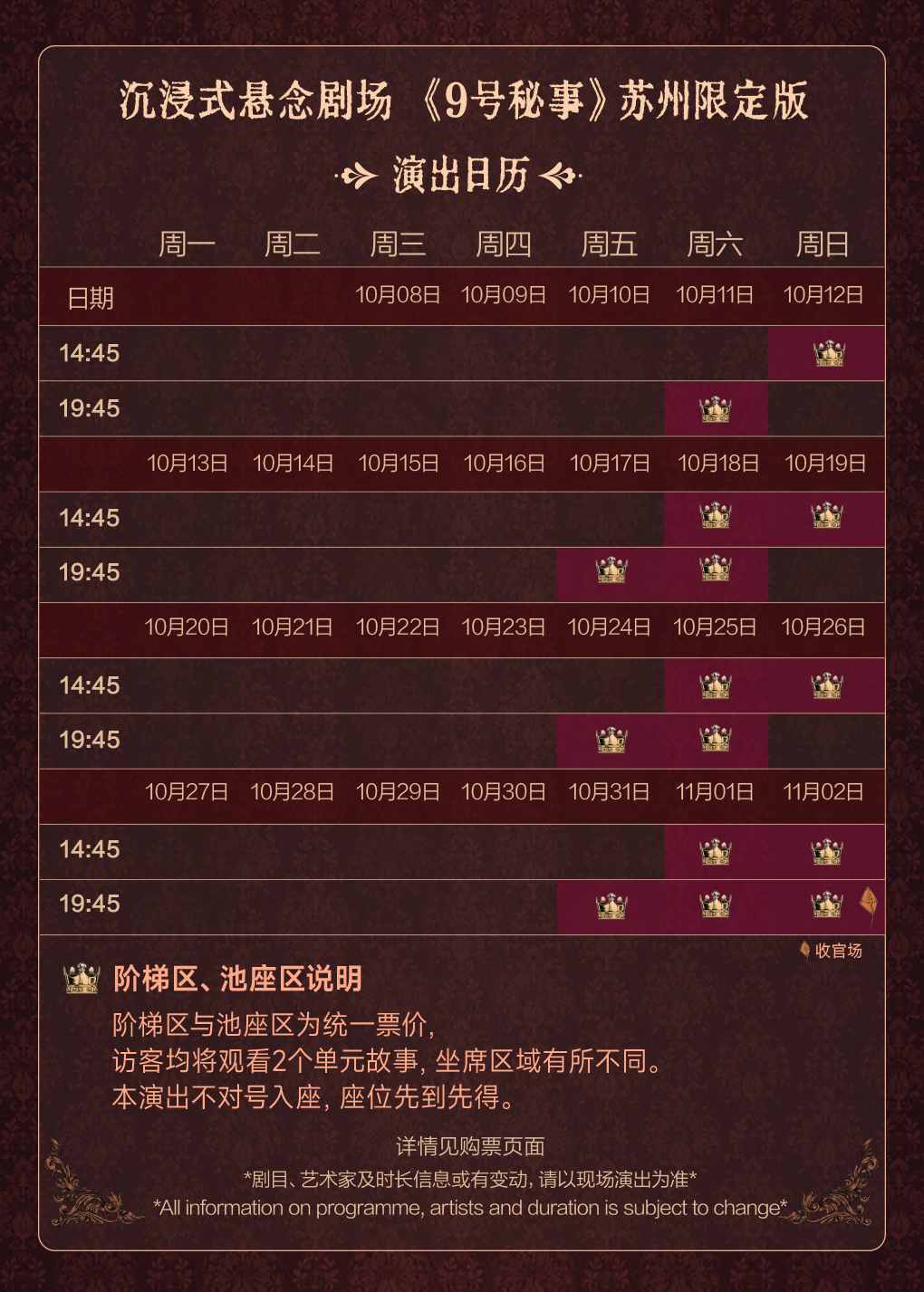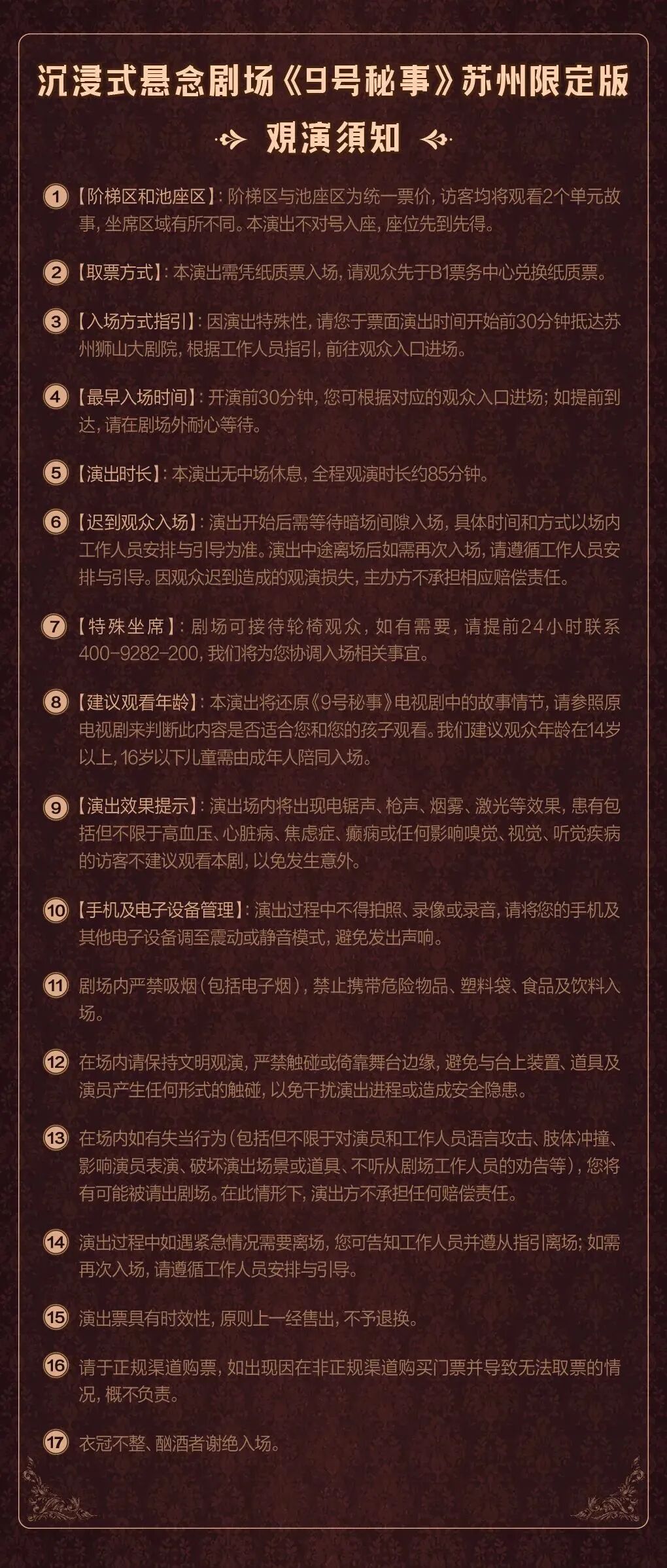 欢迎您记录属于自己的9号观演时刻,如您在小红书等社交媒体发布观演repo,即可获得《9号秘事》苏州限定版纪念票一张。