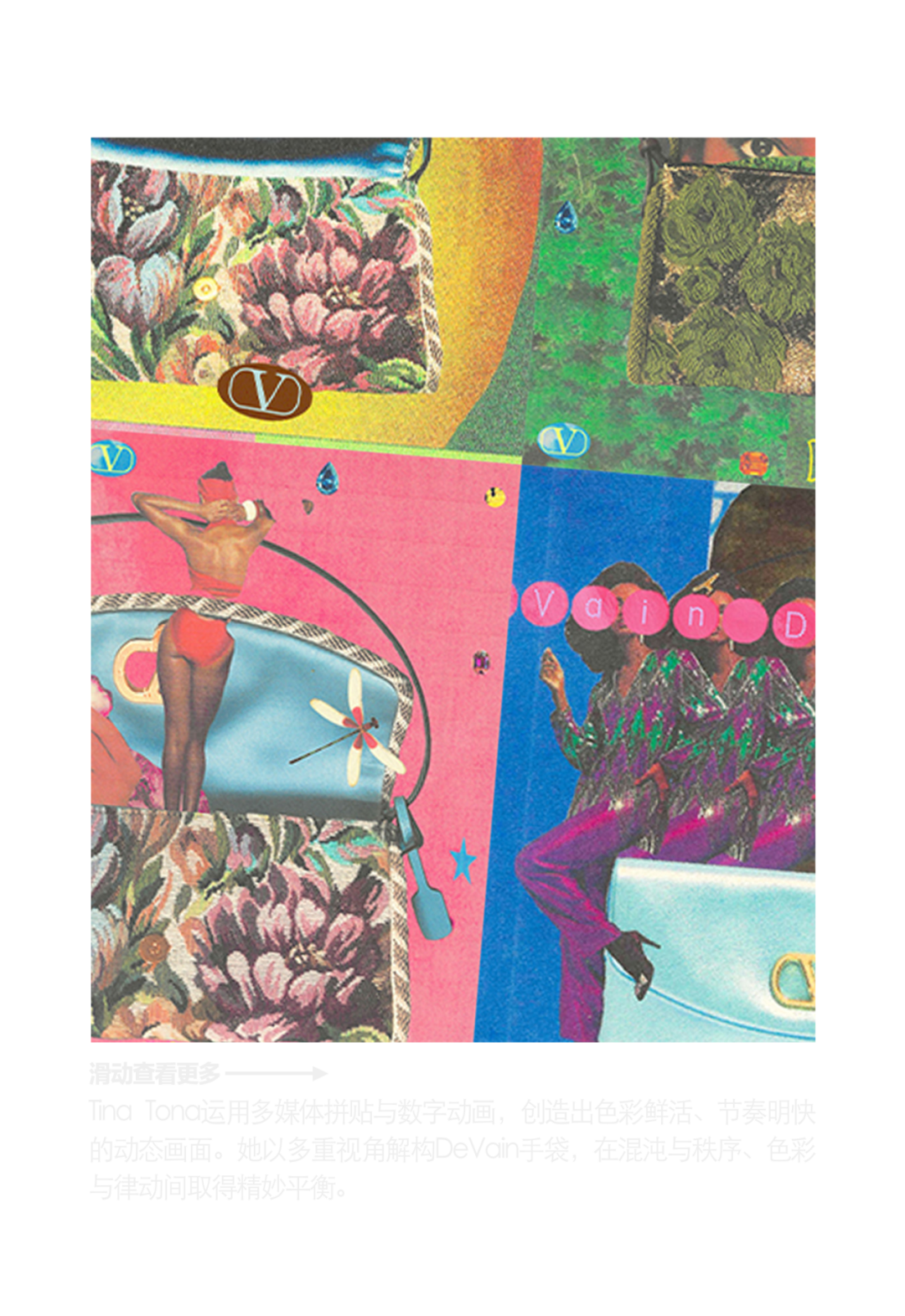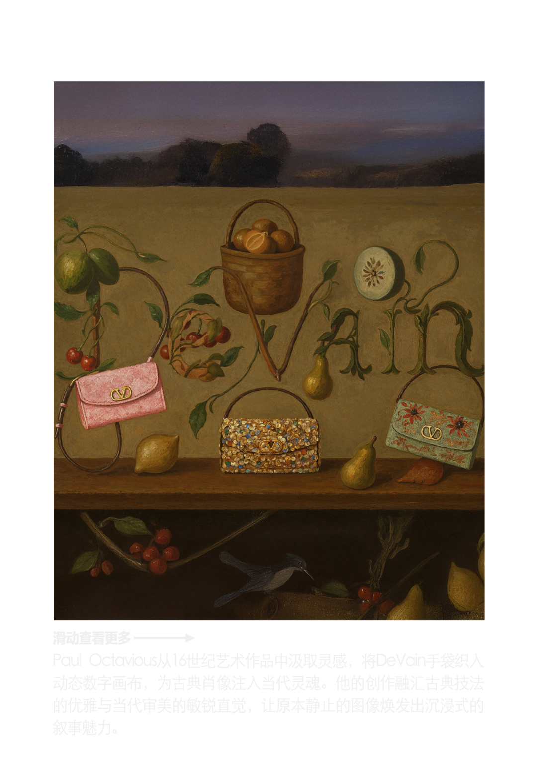 对于创意总监Alessandro Michele而言,时尚从始至终都并非单一感官的“体验”,也从不局限于单一维度。为庆祝DeVain手袋的正式面世,Valentino携手九位国际艺术家,隆重呈现专为DeVain手袋打造的数字创意项目。在这一项目中,DeVain手袋化身为九组视觉作品的主角,成为探索当下创意与美学的起点——借由数字媒介的重塑,它被赋予了全新的艺术表达。这些作品由来自不同领域、各具风格的艺术家倾力打造,共同构筑出一个层次多元、充满当代精神的视觉宇宙。
