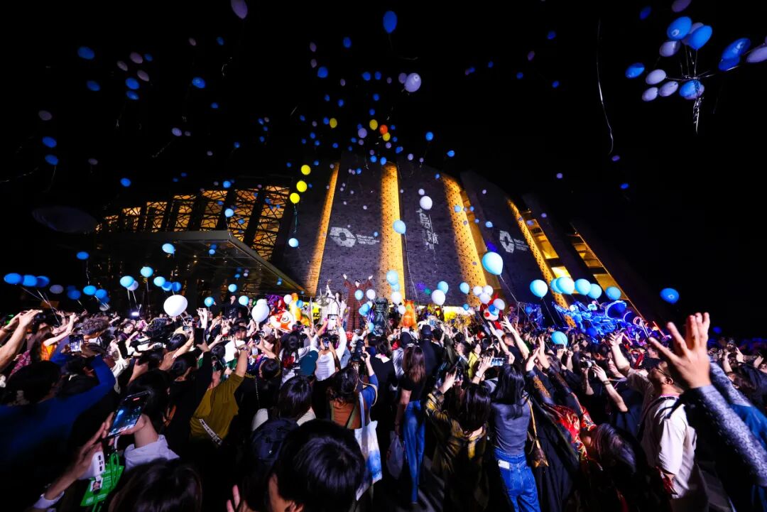 10月17日傍晚,开幕巡游队伍沿着陆路水路并进,共绘一幅热闹非凡的流动画卷,行至乌镇大剧院放飞承载着快乐与祝愿的气球。
