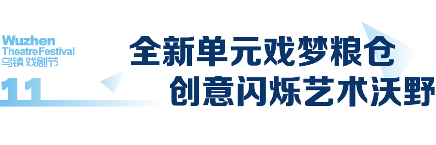 第十一届乌镇戏剧节设立全新单元戏梦粮仓,在乌镇北栅艺术园区的粮仓区域创作新空间戏剧,开展包括互动空间、After Party、工作坊等形式在内的衍生活动。北栅粮仓自由开放的氛围容纳更多近距离互动,吸引戏剧从业者与爱好者走入其中,促进戏剧与多维度创作的灵感碰撞。新单元、新理念、新尝试,铸造戏剧的新可能!