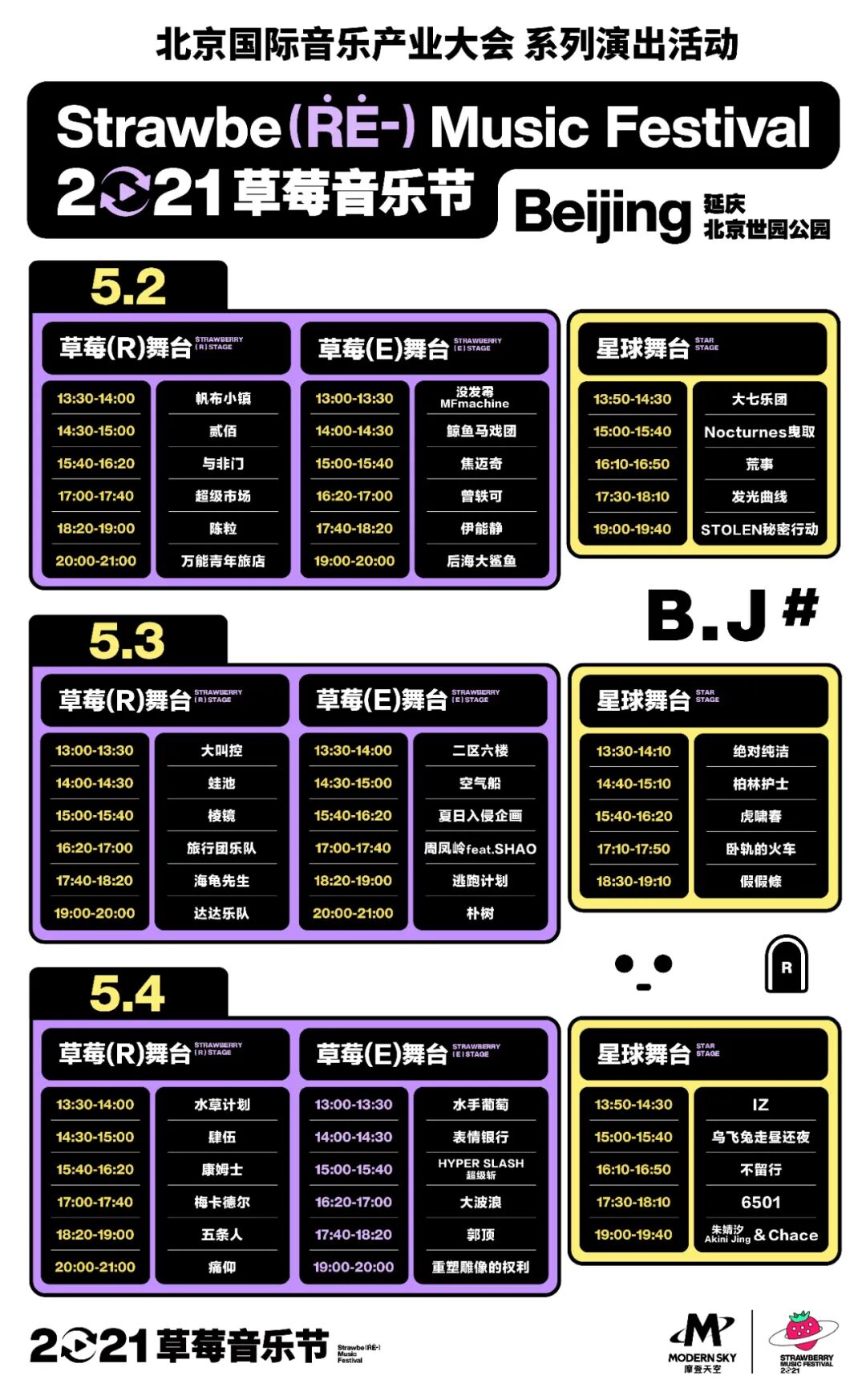 作品有着丰富的故事性和真挚寓意,凭借积极、勇敢的音乐内核与听者形成共鸣,深入人心的康姆士;燃烧著的宅核、电子核、另类摇滚乐队HYPER SLASH超级斩;华语最强死核、重型现场之王肆伍;以Indie Rock为基底,融合了电子、Dream pop、Trip-hop等多种风格,不断好奇探索自己边界的表情银行(此次北京草莓,也是他们回国后的首次演出);保持着摇滚乐的原始激情,又延续了雷鬼的精神线索的水手葡萄;由贝斯手DaYang以及电子音乐制作人x4m组成电子摇滚乐队水草计划。
