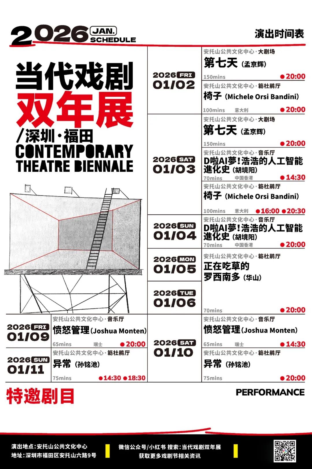 第五届“当代戏剧双年展/深圳·福田”将于2026年1月2日-1月11日举办,由中共深圳市福田区委宣传部、福田区公共文化体育发展中心主办。
