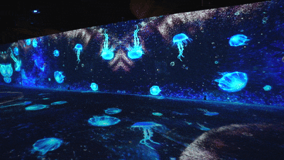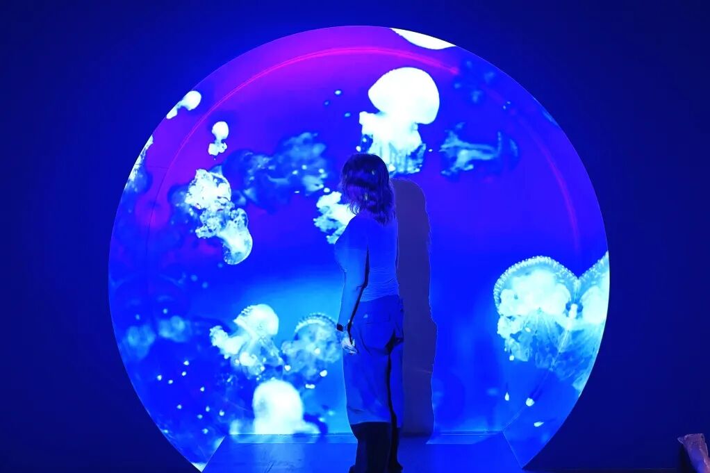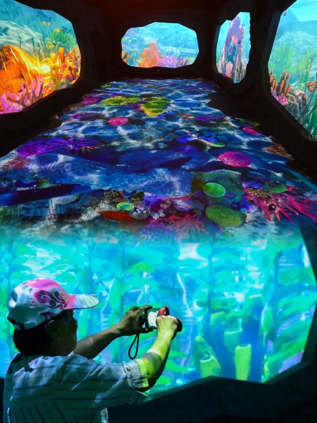 光影区域呈现海洋的极致唯美,在数字粒子海中奔跑,挥手惊散远古鱼群,跺脚触发海浪迭起。感受到海洋作为纽带,将自然、科技与人类紧密连接,小朋友们玩得不亦乐乎!这片由光影和水波构成的幻想空间,水母等荧光海洋生物在四周游曳,如同星辰坠落凡间,演绎着一场生命交响曲。一定要在这里打卡,让流动的光影照耀在身上,超级出片!