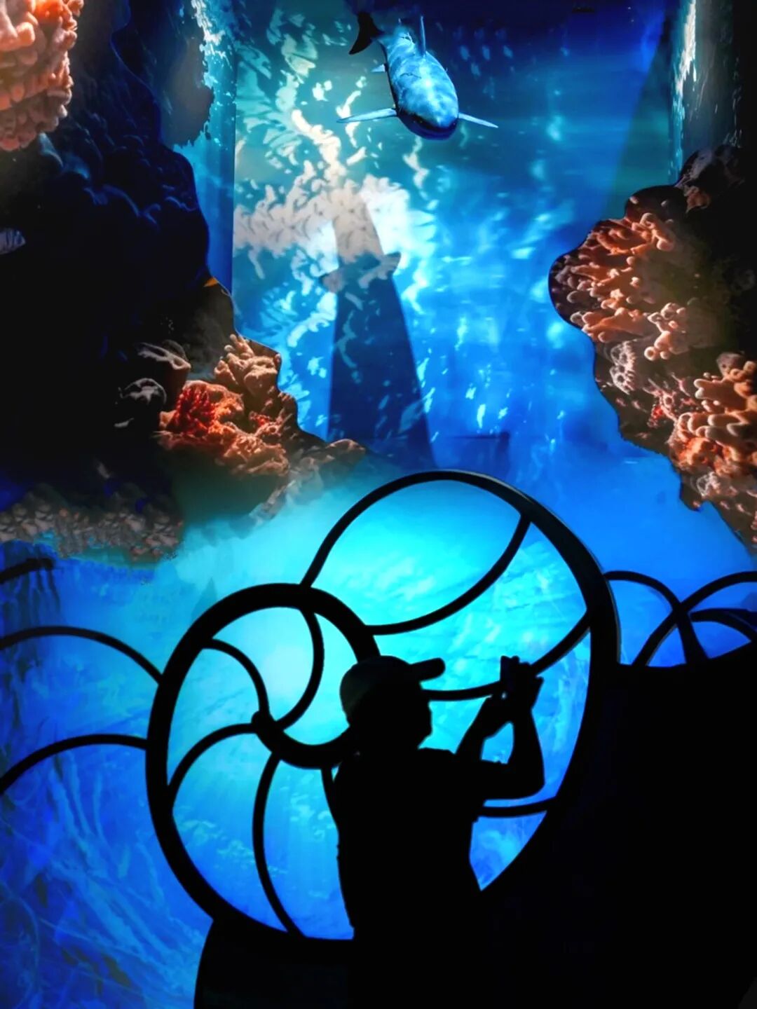 进入“海洋之门”,瞬间被蓝色的漩涡所吸引。墙上的螺旋纹像会呼吸的海螺壳,光影里有小鱼群游过,有种进入深海隧道的感觉!站在发光的海螺墙面前,水波纹若隐若现,浪漫无比。