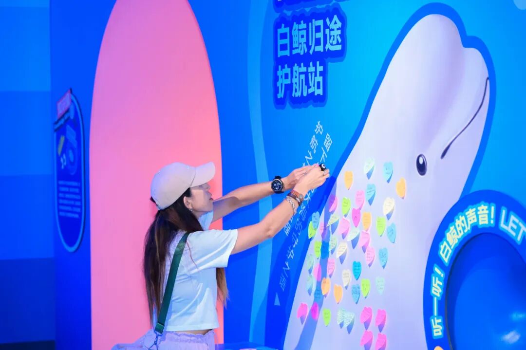 展览的终极目标,是引导观众从对海洋之美的赞叹,升华为对海洋保护的深切关注与行动自觉。展览上的“白鲸归途护航站”以白鲸贝贝的故事为叙事蓝本,通过互动科技与情感共鸣的双重路径,唤起公众对海洋生态保护的深度认知。观众的暖心留言贴满了留言板,上面承载着无数观展者的承诺。