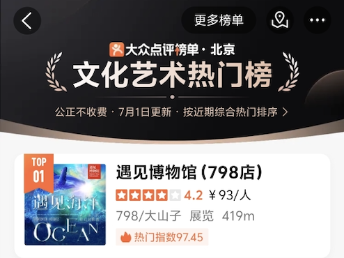 “遇见海洋:沉浸式奇幻光影展”在千平现实空间内,重现了一场跨越时空的海洋史诗之旅!展览启幕当日便引爆观展热潮,以现象级客流成为暑期档文化艺术“顶流”行列。遇见博物馆更一举斩获“文化艺术热门榜Top1”及“必逛展馆Top1”双料冠军!