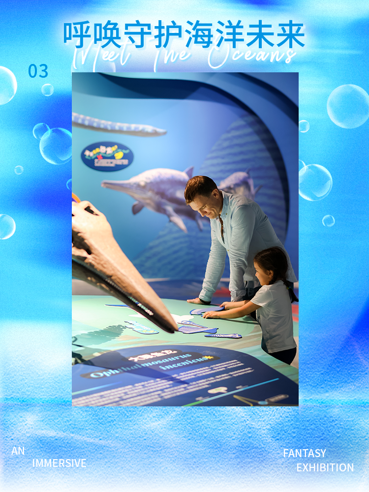 展览以“海洋之门”“海洋奇梦园”“多彩海洋”“海洋光影秀”四大单元构筑时空走廊,以层层递进的叙事节奏,引领观众从光影交织的感官入口启程,穿越海洋生命的演化长廊,抵达情感与未来图景交融的沉浸殿堂,最终共创海洋未来。本次展览的核心魅力,在于其运用前沿数字技术打造的180度沉浸式体验,让观众从“观看者”转变为海洋奇境的“参与者”与“创造者”!