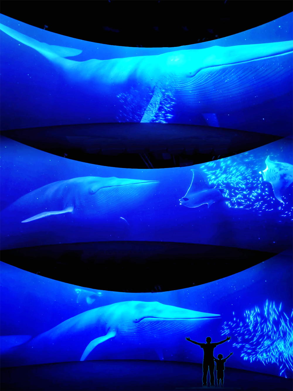 在“海洋光影秀”单元,大家将完全沉浸在由光线、色彩与声音编织的深海梦境!瑰丽景象在眼前磅礴展开:巨鲸的幽影从头顶缓缓掠过,绚丽的鱼群在身边环绕游弋,奇异的深海生物在黑暗中发出点点荧光。观众仿佛置身于流动的海洋之心,感受潮汐的呼吸、生命的脉动。