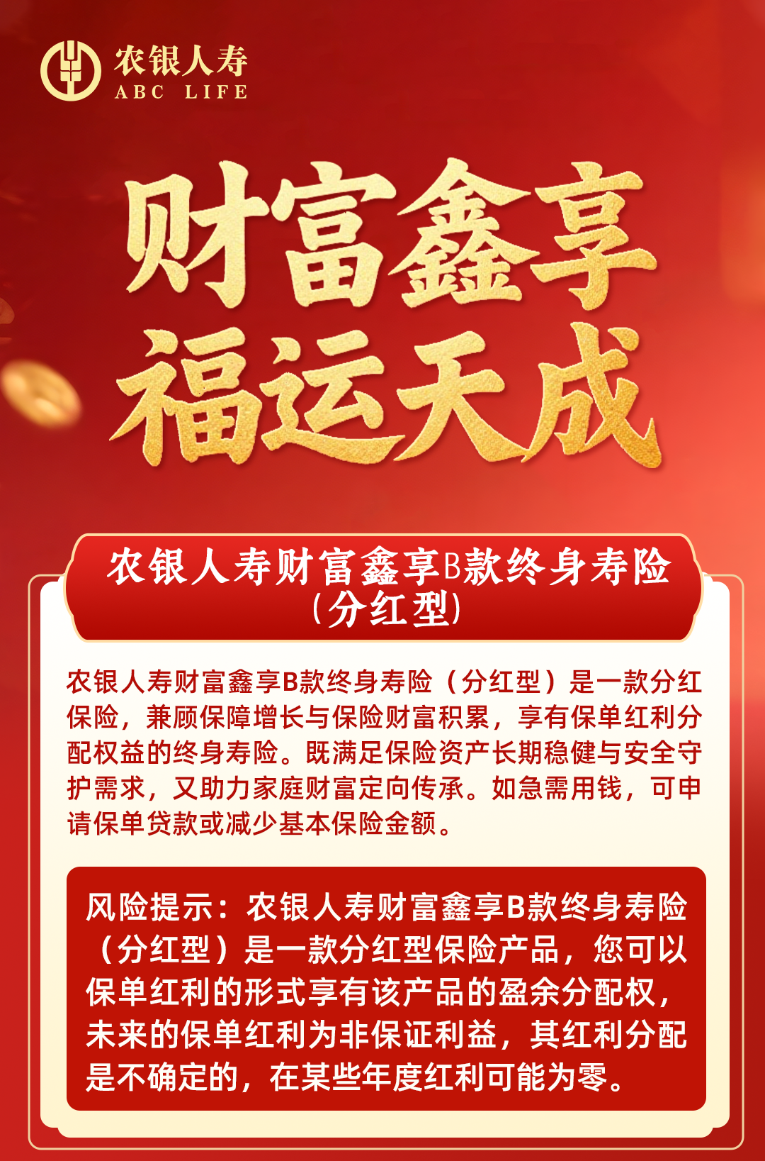 基于对责任的坚守,农银人寿推出「财富鑫享B款终身寿险(分红型)」。它不仅仅是一份产品,更是一份着眼于未来的保险规划方案。