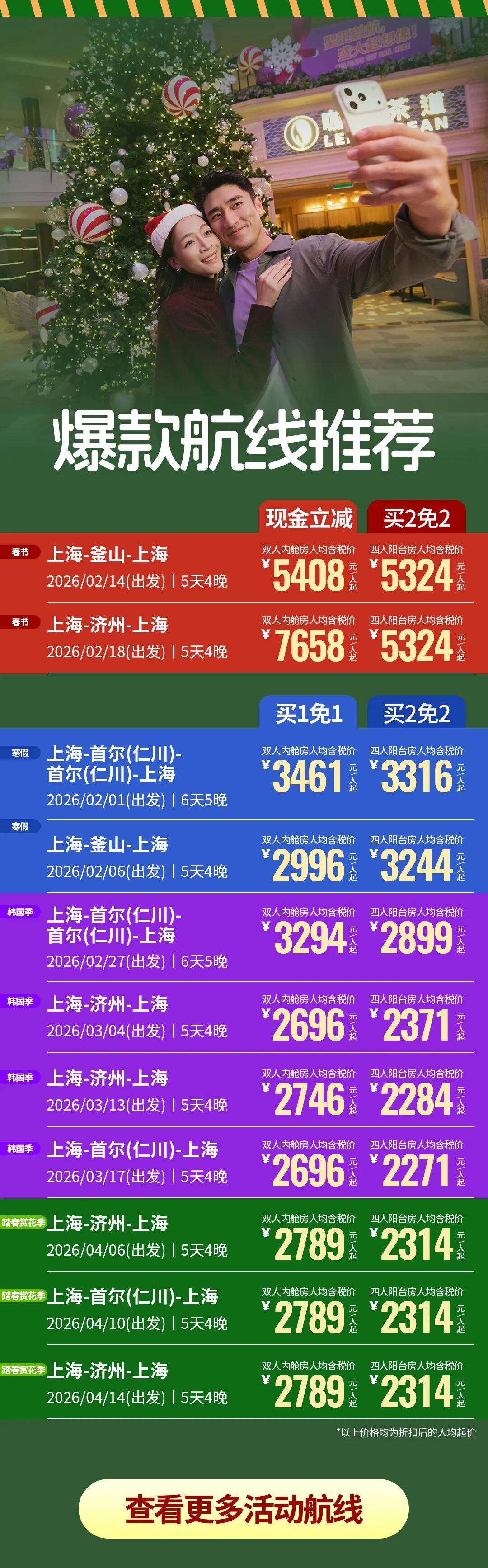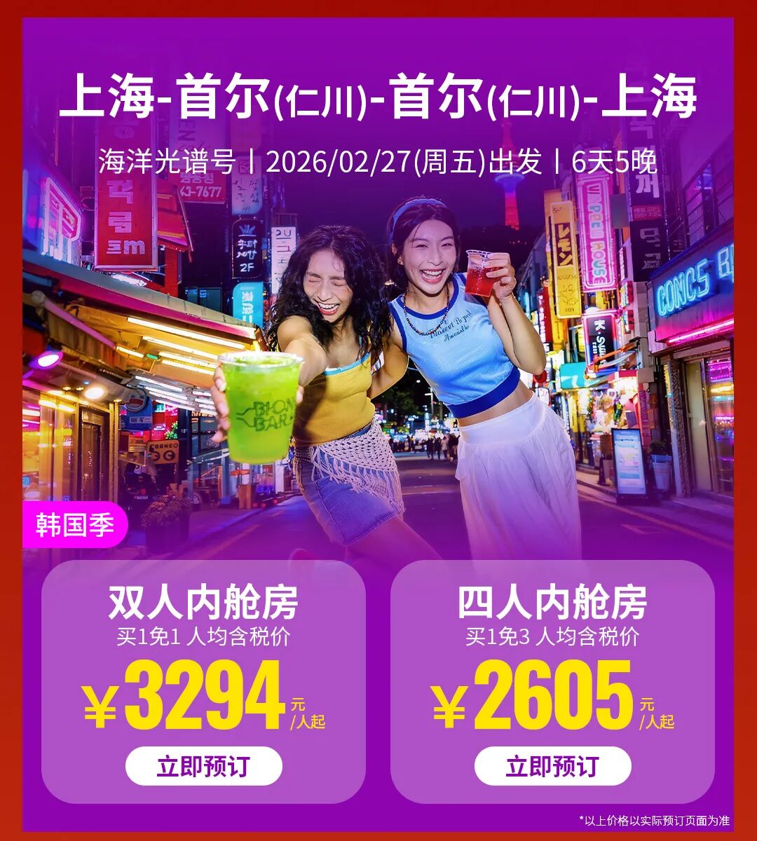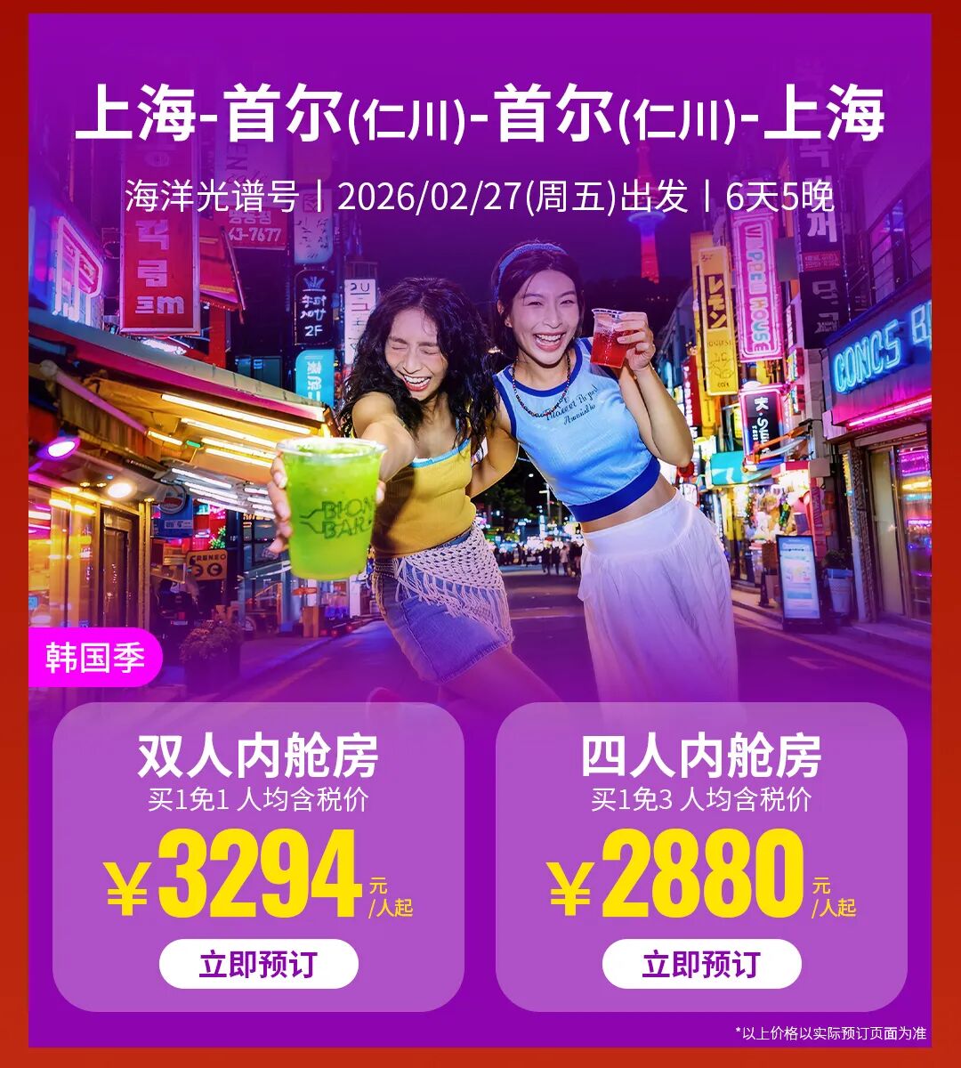 韩国航线¥465/人/晚起,覆盖春节寒假,买1免3玩转潮流光谱号,免签出国尽享节日气氛!