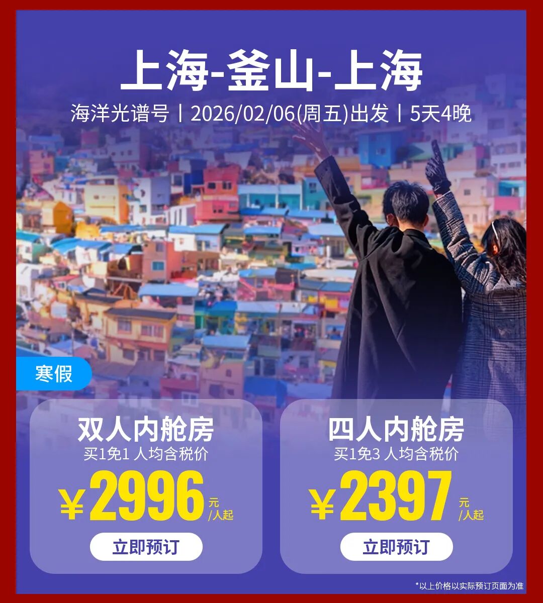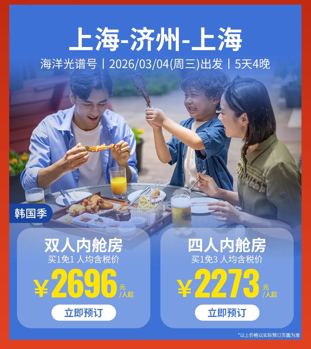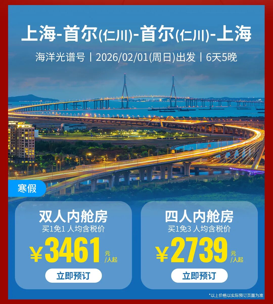 韩国航线¥465/人/晚起,覆盖春节寒假,买1免3玩转潮流光谱号,免签出国尽享节日气氛!