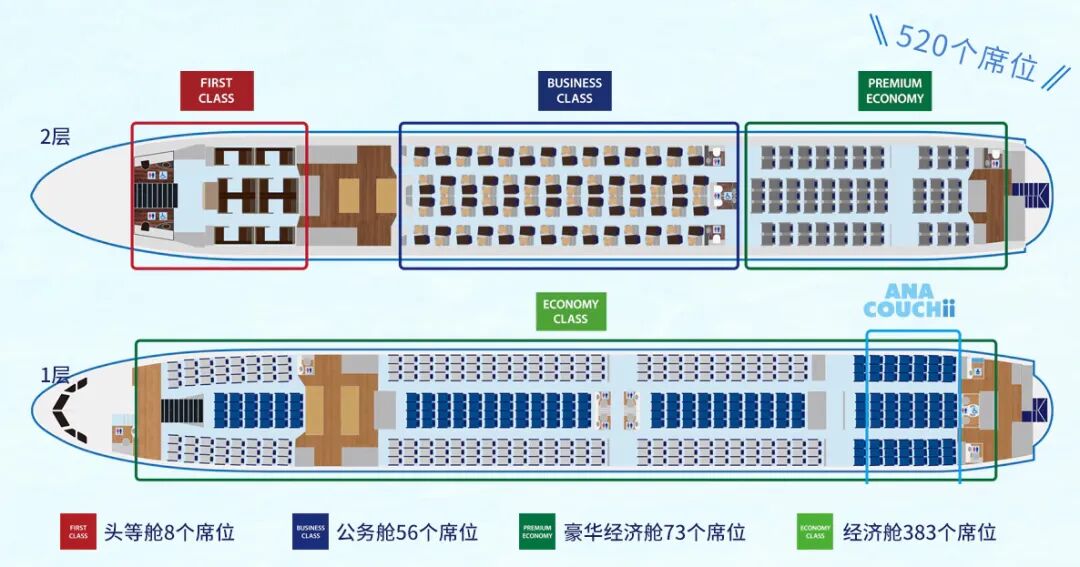*ANA COUCHii是日本的航空公司中首次采用的特殊沙发座椅,目前仅可在空客A380客机上体验。