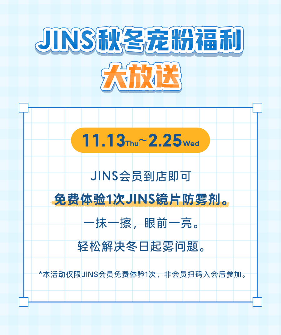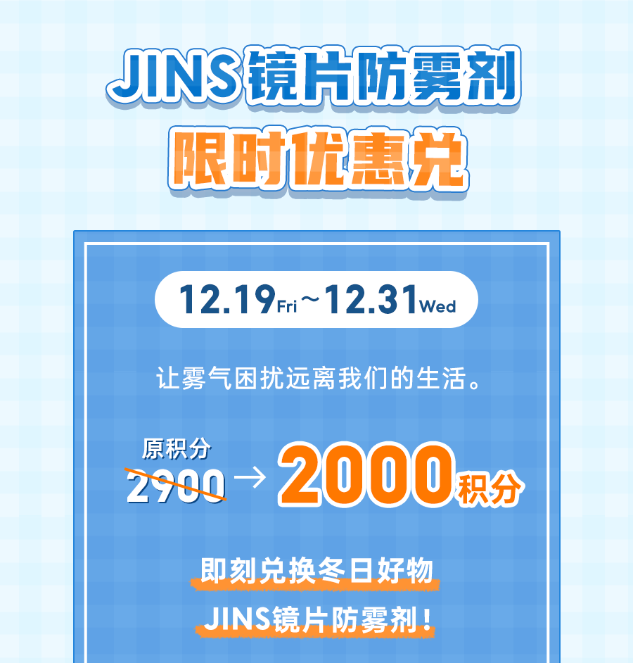 {"品牌":"JINS 睛姿","主题":"JINS镜片防雾剂免费体验及积分兑换活动,解决冬日起雾困扰","产品":"JINS镜片防雾剂","目标人群":"JINS会员, 戴眼镜人群, 冬季易受镜片起雾困扰者, 火锅爱好者, 热饮消费者, 频繁室内外切换场景用户","推荐标签":"镜片防雾, 冬日护镜, 会员福利, 积分兑换, JINS防雾黑科技, 免费体验, 火锅不起雾"}