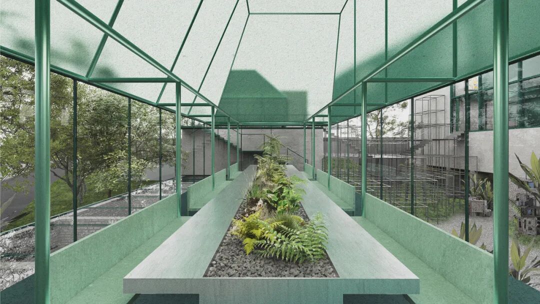 室内组作品则更多从工艺与身体经验出发。“景德镇红旗瓷厂釉下彩陶瓷手作空间改造设计”将釉下彩工艺的生产流程直接引入空间组织,使手作不再停留于展示层面;“栖亭间”以雅集文化为线索,通过连续空间叙事回应当代精神压力;“再构之境”则以固废材料为对象,将“再生”视为持续发生的空间行为。