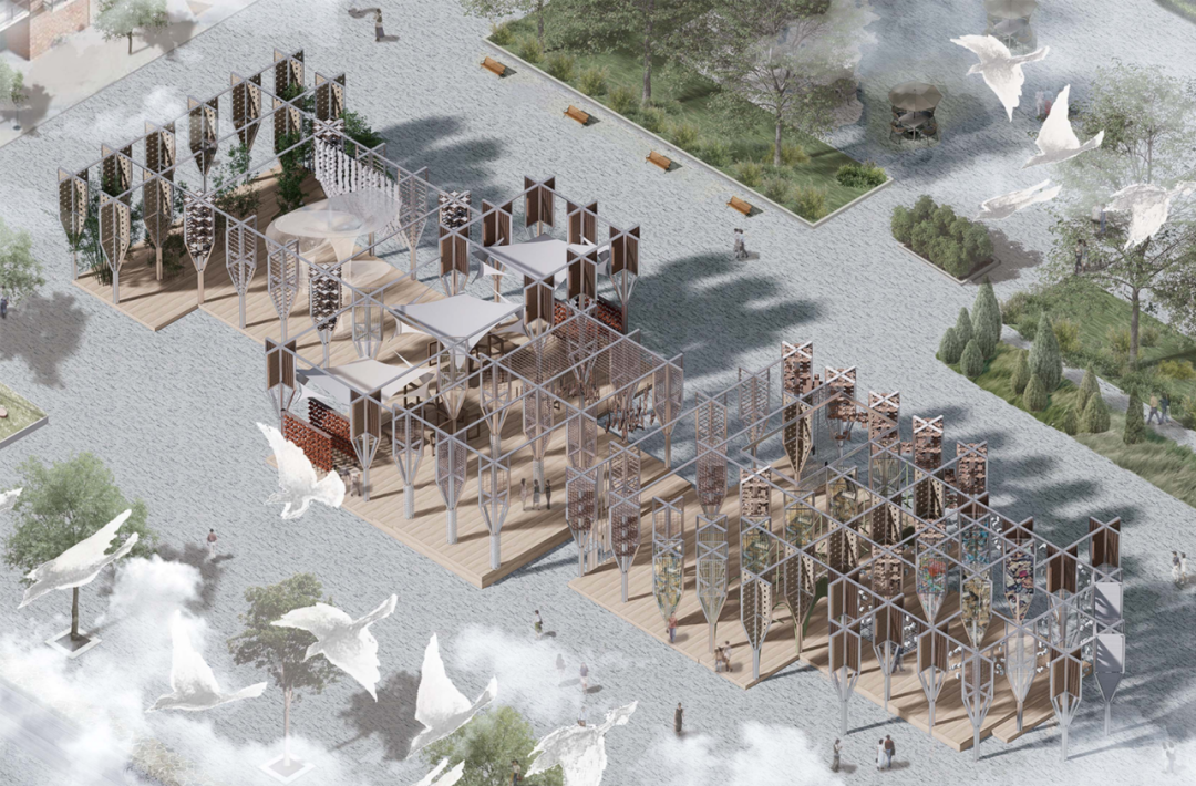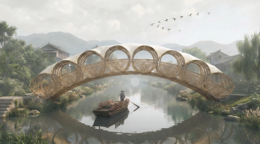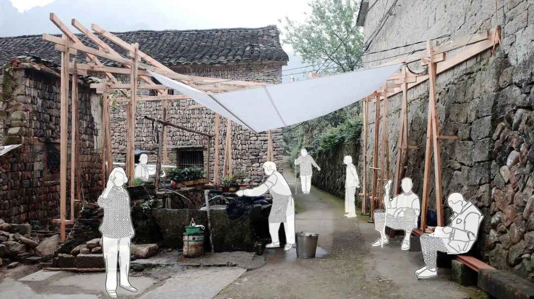在建筑组中,“山间山茶叶研学基地”以木桁架系统为基本构成,通过复制与变体形成与丘陵地形相呼应的屋顶秩序,使结构成为空间体验的一部分;“竹韵水映”从岭南竹编工艺出发,将材料的柔性转译为桥体结构与光影系统,使桥梁成为水乡文化记忆的当代延续;“衣桁叠院”则提取村落中“晾衣架”这一日常构件,通过低干预的构筑方式,将建筑重新嵌入农耕与生活路径之中。与此同时,“街区之序”“定海桥往事”等方案,将视角转向高密度街区与废墟更新,通过材料重组与空间再叙事,回应城市语境中的现实复杂性。
