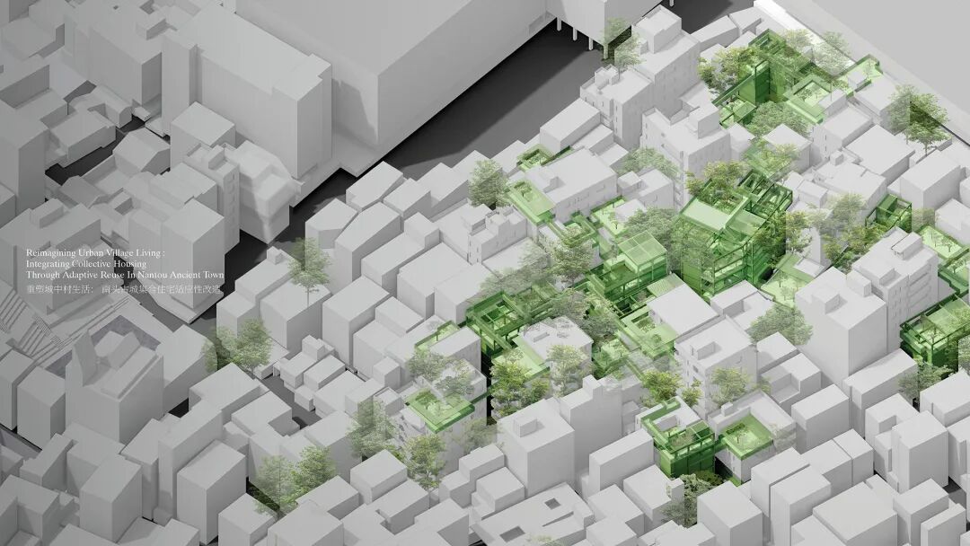 南头古城近年来通过文化与商业更新激活了部分街区,但真实的居住空间仍然被隔离在主轴线之外。方案正是从这一断裂入手,将“居住”重新作为更新的核心议题,而非附属条件。在设计策略上,项目并未提出整体推倒重来的规划蓝图,而是通过“集体住宅+适应性再利用”的方式,从街区、社区到单体三个层级展开渐进式介入。街区层面,通过拆除条件恶化的关键节点建筑,疏通流线并建立立体连通体系;社区层面,在结构与日照条件较好的既有建筑中嵌入共享厨房、公共客厅等微公共空间,重建邻里交往的可能性;单体层面,则以减法为先,打开原本封闭的阳台与界面,使空间回到可调整、可再生的状态,再通过轻钢加建与装配式构件完成必要的功能补充。