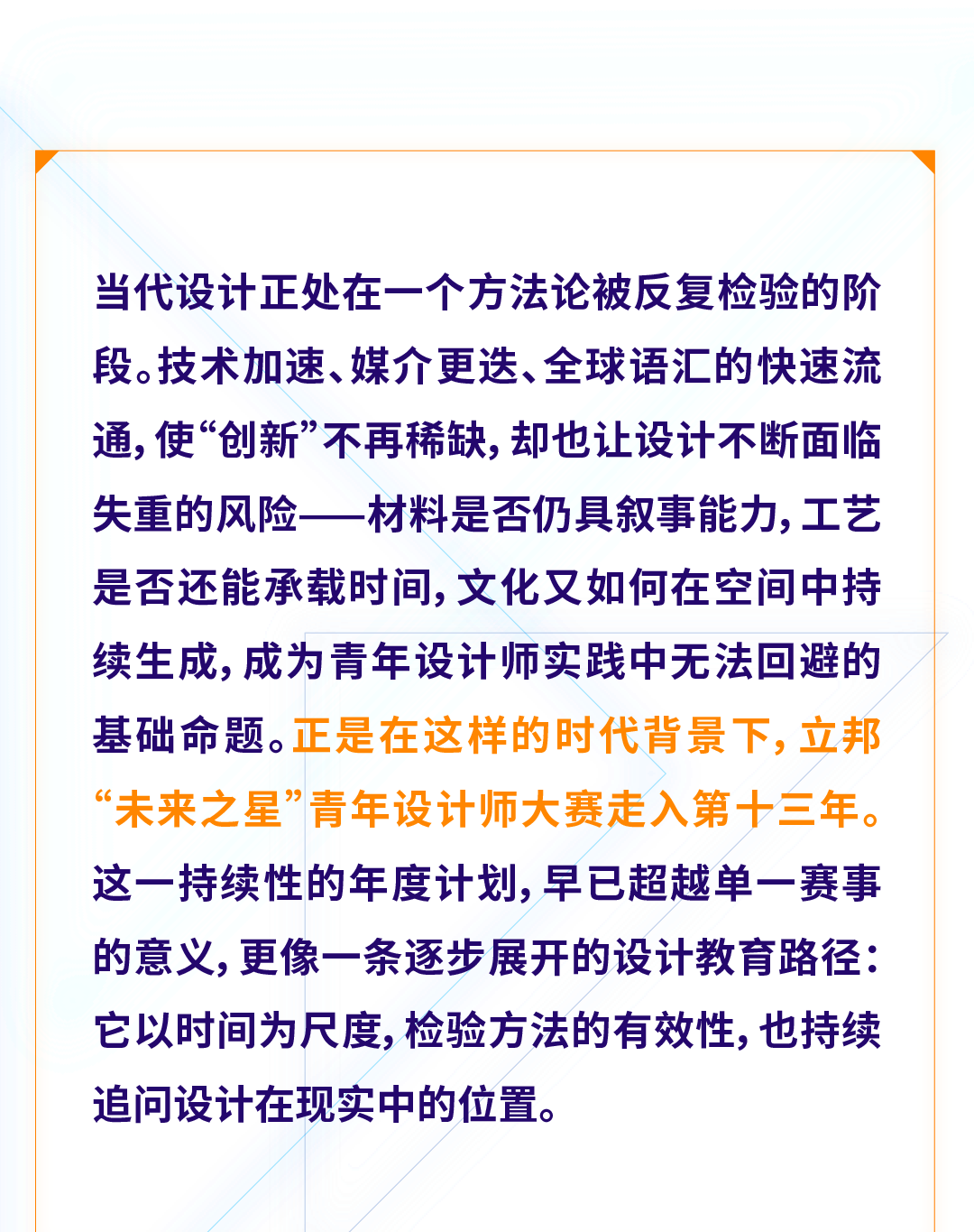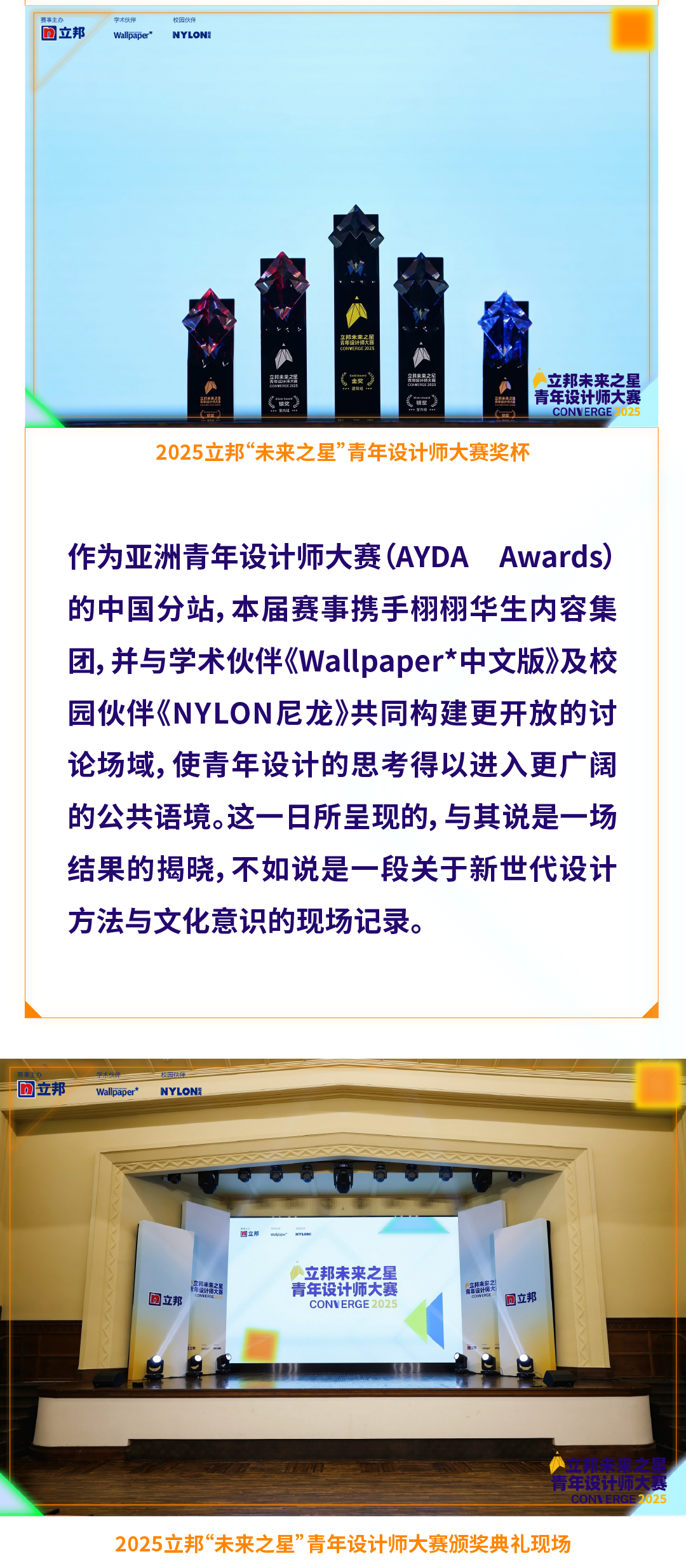 在“筑迹永续,艺脉相承 / CONVERGE: Crafting Cultural Legacies”这一主题之下,2025年立邦“未来之星”青年设计师大赛并未将“文化”与“传承”作为先验立场预设,而是将问题重新放回设计发生的现场:材料是否仍具表达能力,工艺是否还能构成空间生成的逻辑,文化经验是否真正进入当代建造与使用之中。这些问题被明确置入本届赛事的评审体系与实践语境之中,成为判断方案有效性的核心坐标。