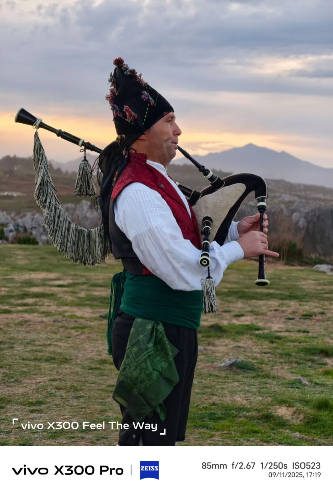 身着加利西亚传统服饰的风笛手,在旷野中演奏当地代表性乐器 Gaita Gallega