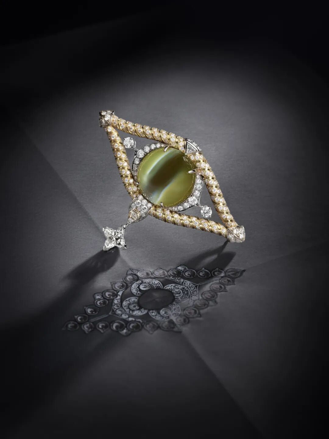 路易威登Virtuosity高级珠宝系列,将古埃及“智慧之眼”化为当代护身符。一颗32.85克拉斯里兰卡金绿猫眼宝石凝聚幽邃光带,仿佛能洞察所有真相;钻石与品牌经典扭索纹交织,抛光黄金与宝石火彩碰撞出流动鎏光;悬垂的“老花”星形切割钻石,是指引方向的星辰。它不承诺预知未来,却能让你在纷扰中保持清醒。