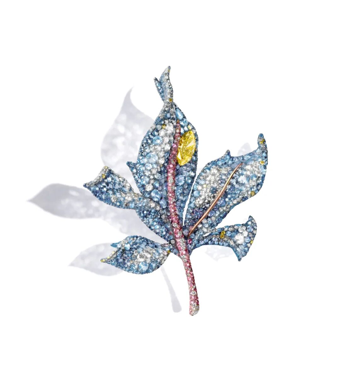 珠宝设计师赵心绮(Cindy Chao)的White Label高级珠宝四季系列枫叶胸针,便是自然魔法的具象化。一颗3.02克拉马眼形浓彩黄钻,是被秋日吻过的阳光核心;2448颗白钻、黄钻与各色蓝宝石,在钛金属与18K黄金的骨架上,复刻出光影在叶脉间流动的瞬间。这不是对一片枫叶的简单摹写,而是一首镌刻在珠宝上的自然诗篇。