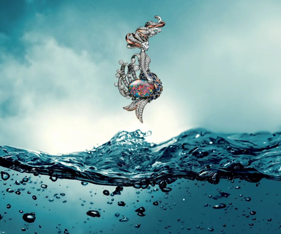 蒂芙尼“瑰海奇珍”系列美人鱼胸针,把深海魔法封存在一颗超10克拉的黑色欧泊里。红、绿、蓝色调的游彩随光线摇曳,像极了人鱼鳞片的微光;欧泊内部二氧化硅球体对光的天然衍射,与银幕上的咒语特效异曲同工,仅凭变幻的色斑,就能唤醒你对深海的全部想象。