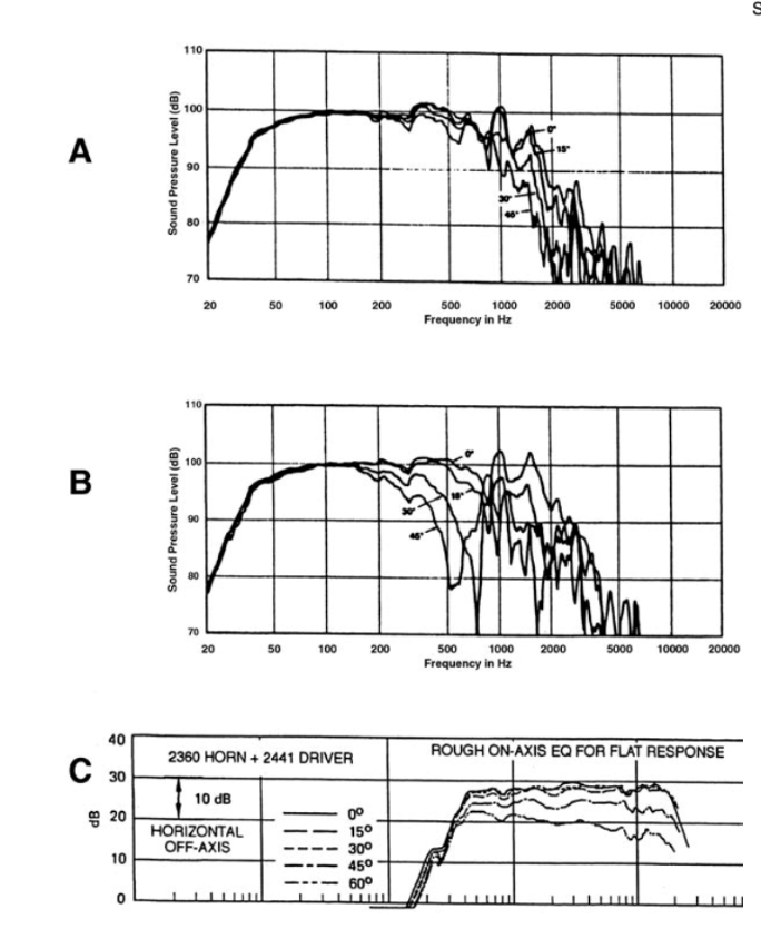 三张图分别展示了水平方向,垂直方向,和进一步优化过的JBL Professional单元和号角的离轴响应。