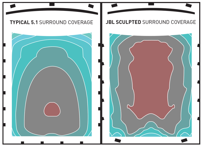 相对于传统音箱,JBL Professional音箱根据影院的声学特点量身定制,可以显著扩展黄金听音位的面积。