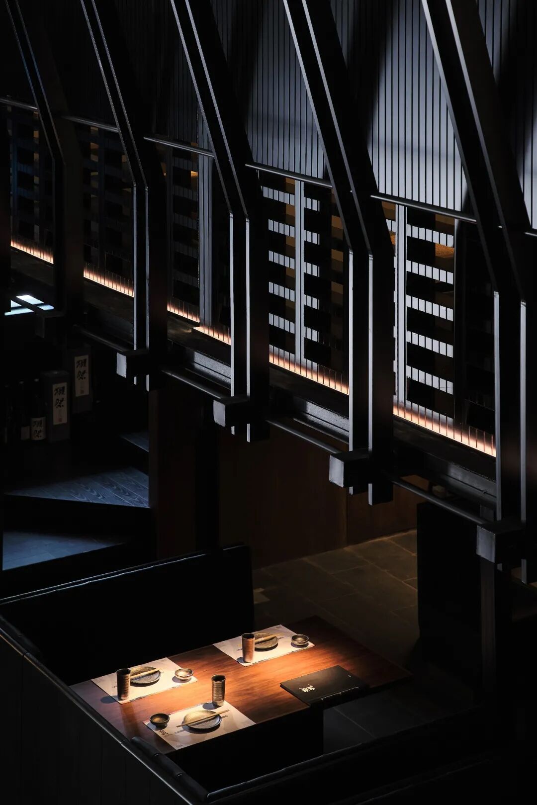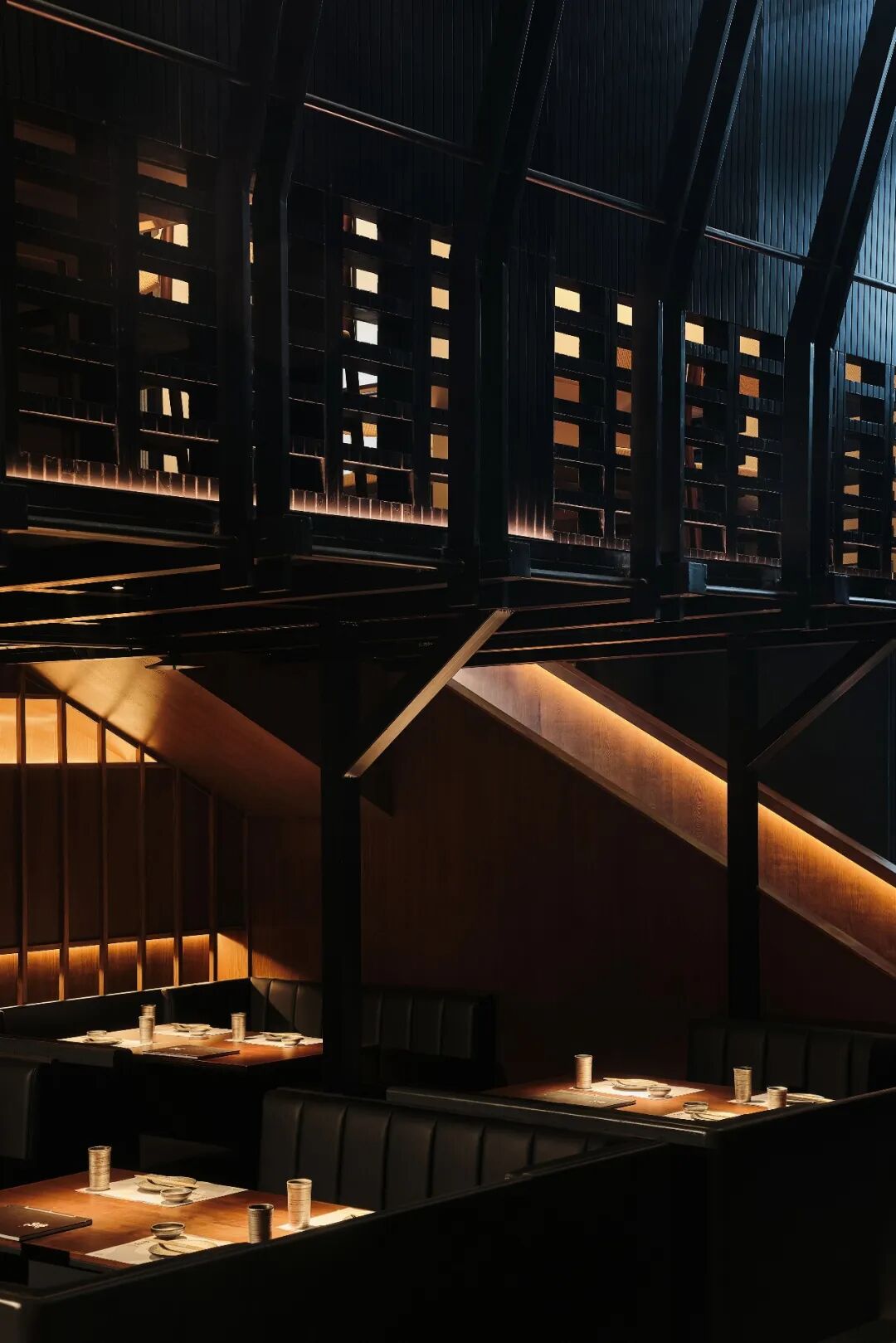 三厘社在红砖斑驳的厂房空间内,精准搭建了一套暗色调的钢构框架。金属的冷峻质感与老厂房的粗犷红砖形成鲜明并置,这种反差感增强了空间的戏剧张力和独特记忆点,完美契合居酒屋夜间沉浸、私密的氛围诉求。