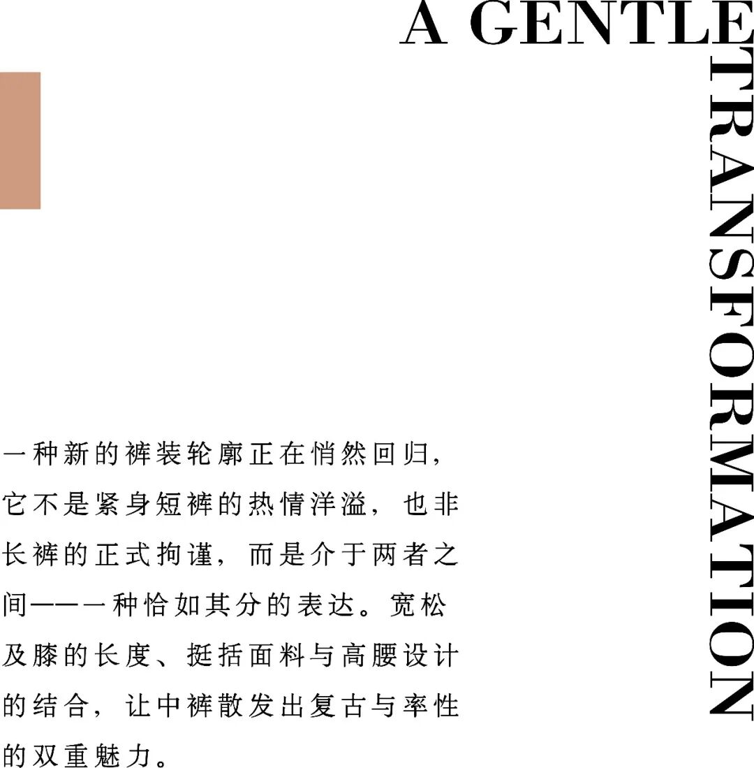 一种新的裤装轮廓正在悄然回归,它不是紧身短裤的热情洋溢,也非长裤的正式拘谨,而是介于两者之间——一种恰如其分的表达。宽松及膝的长度、挺括面料与高腰设计的结合,让中裤散发出复古与率性的双重魅力。