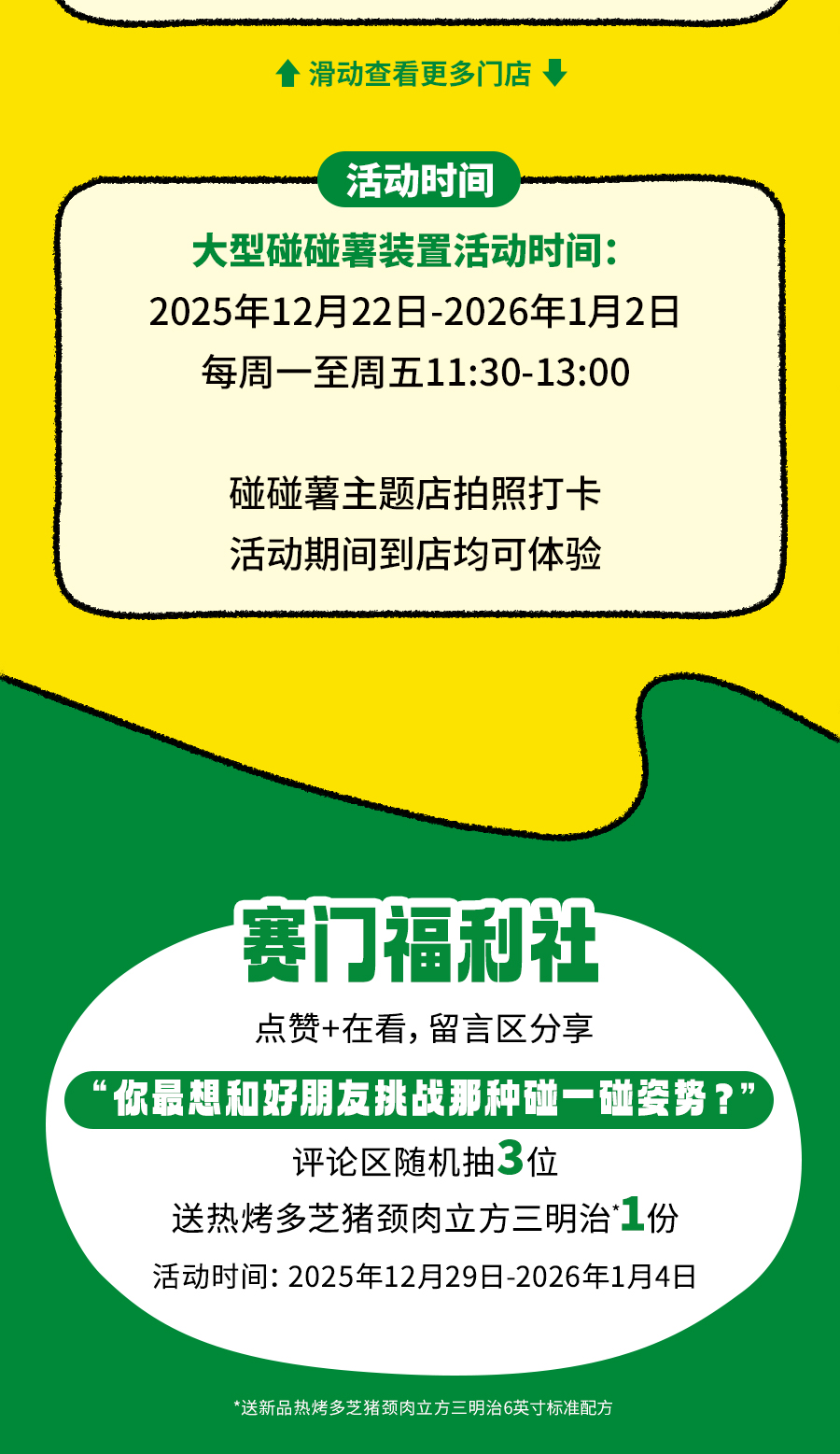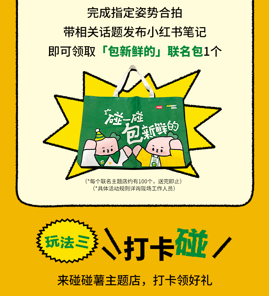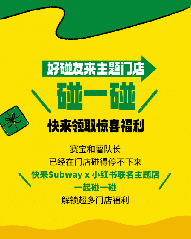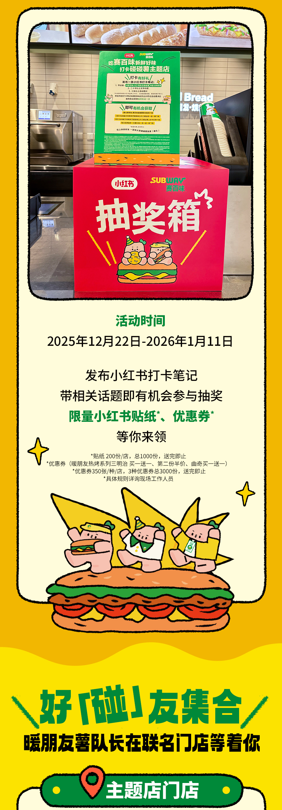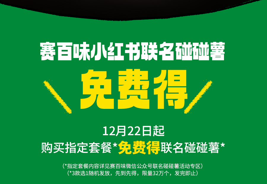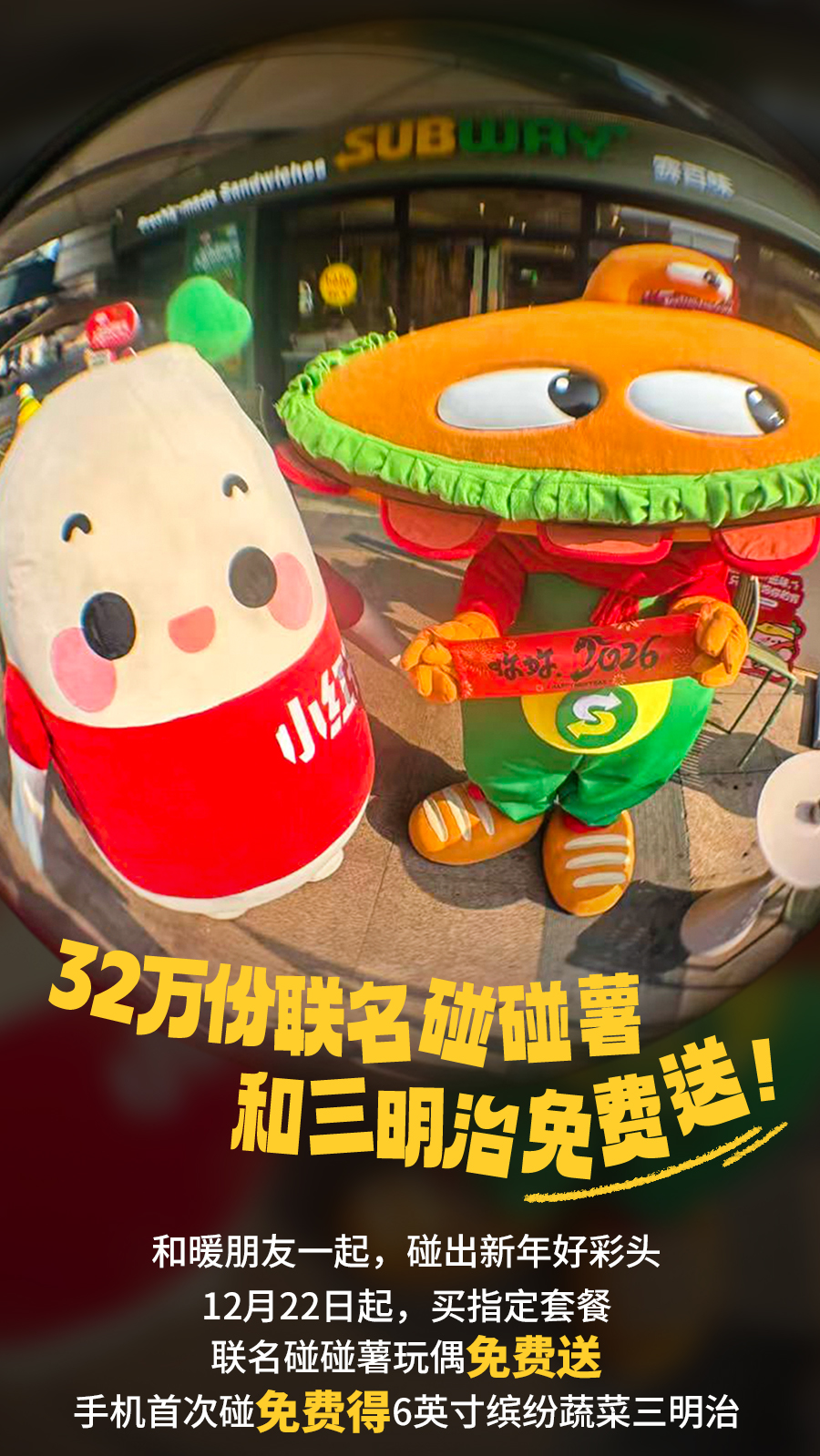 上述活动限2025年12月22日起于SUBWAY®赛百味中国大陆地区部分餐厅供应,机场、火车站等交通枢纽餐厅、旅游景区餐厅、园区内部餐厅等特殊餐厅除外,具体以餐厅公示为准。产品、周边以实物为准,以上为创意图片,仅供参考。活动期间,购买指定套餐可免费加购赛百味小红书联名碰碰薯玩偶1份(下称“碰碰薯”,该活动机制仅适用于赛百味支付宝小程序,赛百味微信小程序及线下门店柜台点单,不适用于第三方外卖平台、大众点评、抖音等其他网上订餐渠道)。指定套餐含早餐套餐、能量碗套餐、三明治/百味卷三/四件套、健盈卡三明治二件套、儿童餐、多人餐(下午茶套餐、三明治/百味卷二件套、eteecy联名套餐等除外,具体详见小程序菜单);碰碰薯全国共限量32万份,数量有限,发完即止。碰碰薯共3款(好饭有好报薯队长挂件玩偶、工位饱贝薯队长摆件玩偶、吃得好薯队长摆件玩偶),随机发放,当日款式以餐厅实际供应为准。免费三明治指首次碰可领取“0元赛百味6英寸标准配方缤纷蔬菜三明治”电子优惠券1张,免费福利指次日起每日碰可领取0元惊喜券1张,凭券可免费兑换小食、饮品、曲奇等。每个碰碰薯每日仅可领取一份福利,单日不可重复领取。福利优惠券的具体有效期、使用规则等请查看券面说明。碰碰薯的具体权益领取规则详见赛百味微信公众号菜单栏 - 新鲜放送 - 联名碰碰薯活动,SUBWAY赛百味可以在法律允许的范围内对活动进行适当调整。Subway® is a Registered Trademark of Subway IP LLC © 2025 Subway IP LLC.