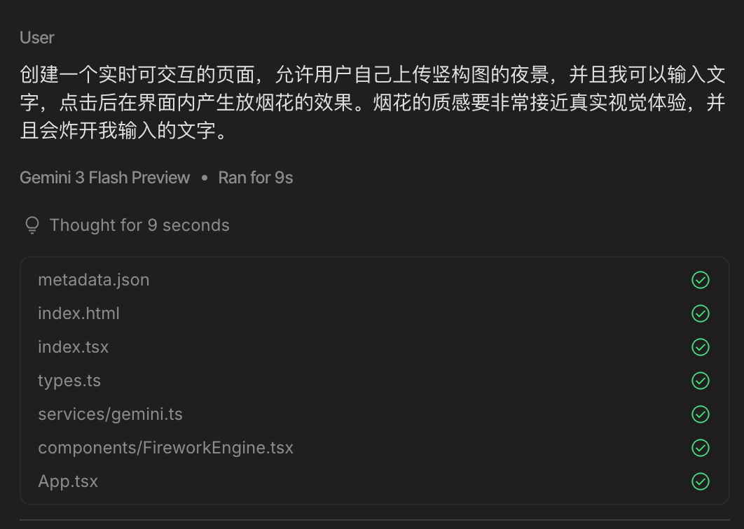 这一交互范式最早由交互实验室开发,而奇点新媒体研究中心在此表现形式基础上,剔除了序列帧的运行强度,改为 CSS 滤色混合模式提升代码结构的运行速度并降低创作难度。更重要的是,我们首次采用 Gemini 工作流来重点处理烟花燃放效果,并录制导出 GIF 动画;音效则采用可灵生成,可谓全方位实验了 AI 产品的跨界式 SVG 场景应用。Gemini 生成烟花特效