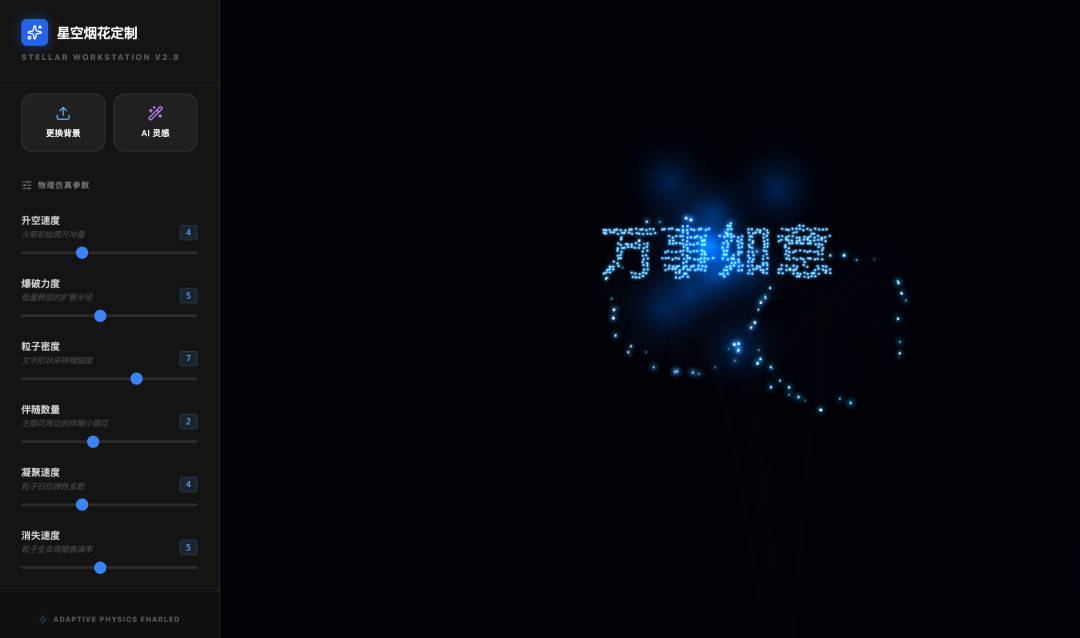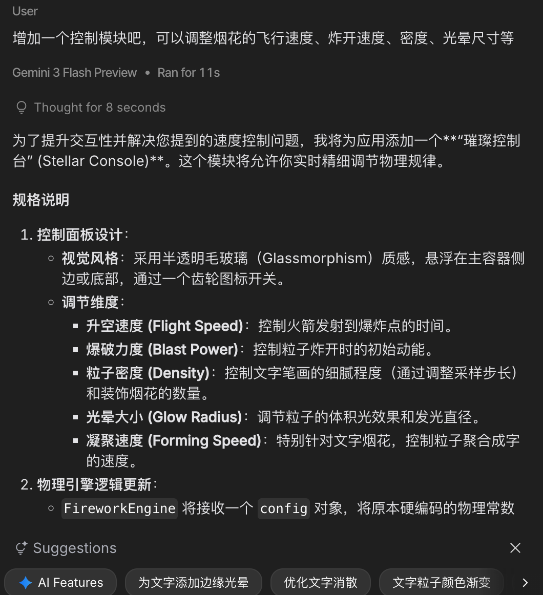 按以往的创作思路,此类烟花效果会首选通过 AE 等视频软件制作,无论套模板还是手搓,Particle 粒子动画的制作强度都不言而喻。现在,我们换一个思路,如果通过纯前端方式是否能一样形成类似的烟花特效?进入 Gemini,先给到一个基本的交互界面方向需求,让它生成一个能让用户自定义烟花文案的功能,测试应用的逻辑运行。第一次产生的烟花效果必然是不会让你完全满意的,那么我们接下来就可以根据它的具体表现进行修改。更巧妙的方法是,在 Gemini 生成一定逻辑合理的烟花特效后,要求其布局出一个控制模块,方便用户对烟花的细节特效进行调整:这样一来,我们不必像摇骰子一样期盼着 Gemini 给出一个随机的优秀结果——而是在当前效果前提下,更自主地控制烟花的生成方式。最后,我们布置了如下的可控参数:接下来的工作就比较简单了,通过 OBS 录屏,以无鼠标指针方式录制多个文案的燃放效果视频,随后导入视频软件裁切出需要的尺寸和片段:对于每个导出的视频,拖拽到 PS 内导出 GIF:可灵生成烟花音效