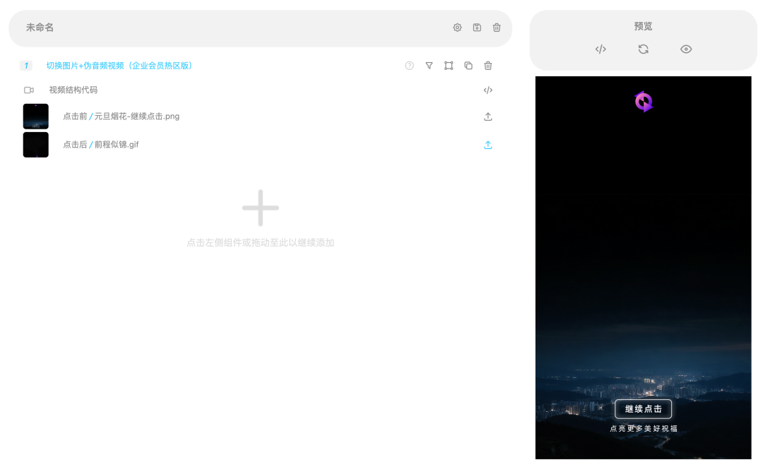 为了确保 touchstart 可以被依次引起,并且每次都能穿透触及下方视频,我们这里采用计育韬老师早期在《微信SVG高级交互排版》课程中提出的抽屉布局原理,将嵌套的烟花 GIF 连续以实际斐波那契数列关系排列,代码上通过嵌套构建,变成无限组合的抽屉阵列:而对于视频的激活,我们借用一下 E2 编辑器中「切换图片+伪音频视频教程」组件架构,这样省去了 rect 热区和视频按钮双重定位的工作量:上传刚才备用的视频文件到公众号,获取它的代码并导入 E2 编辑器的对应 SVG 模版中,再把我们需要的代码取出布局到整体代码内即可。如此一来我们就完成了一个公众号里的电子烟花生成器 SVG,是不是非常简单?欢迎进一步探讨