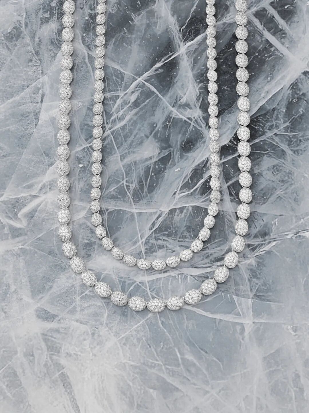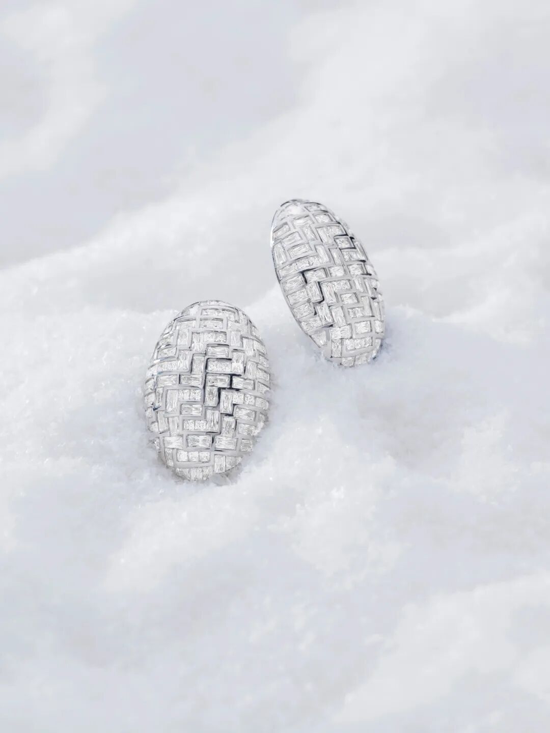 其中备受瞩目的Flocons de neige珠宝单品,运用精湛的密镶工艺,将颗颗锆石紧密排列,构筑出饱满而立体的弧线,从每个角度都能捕捉到如初雪般柔和的折射光。