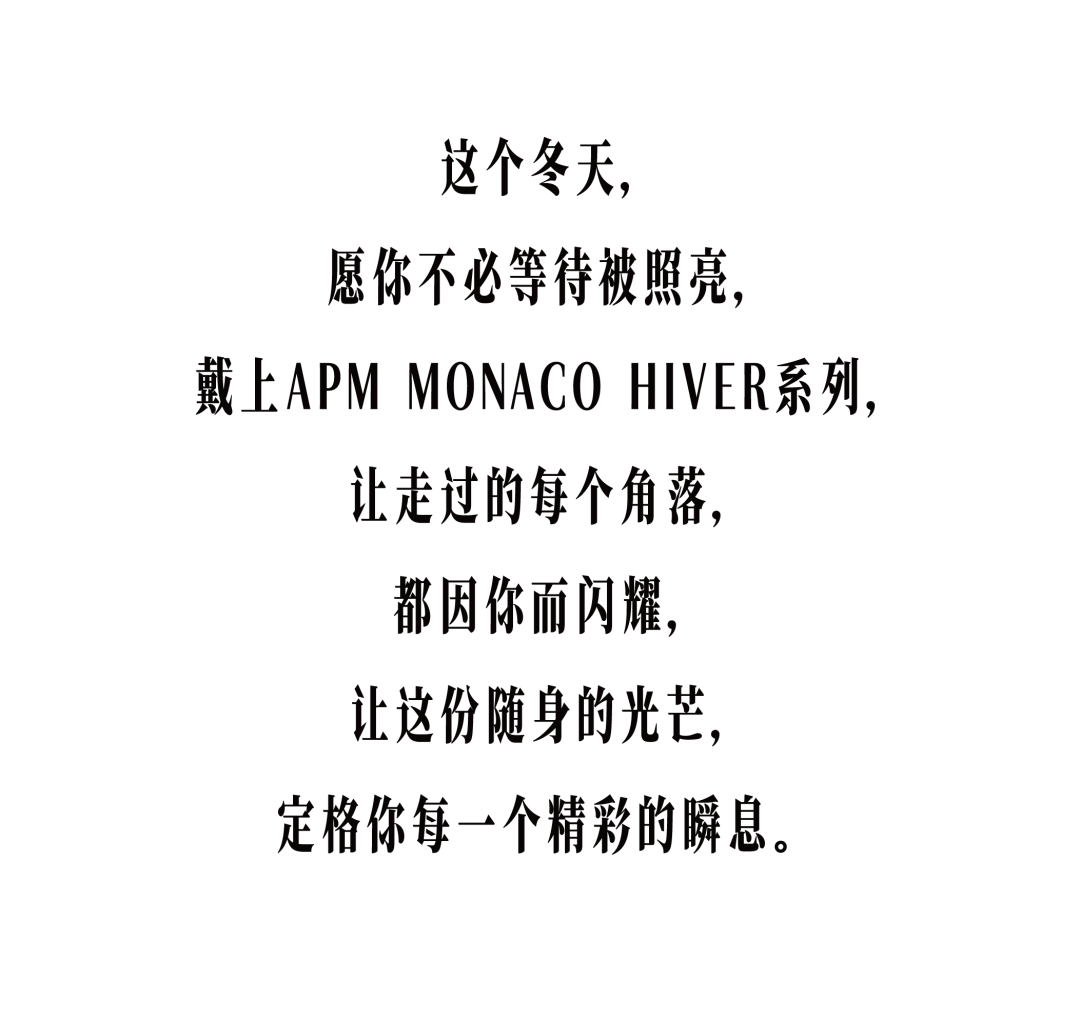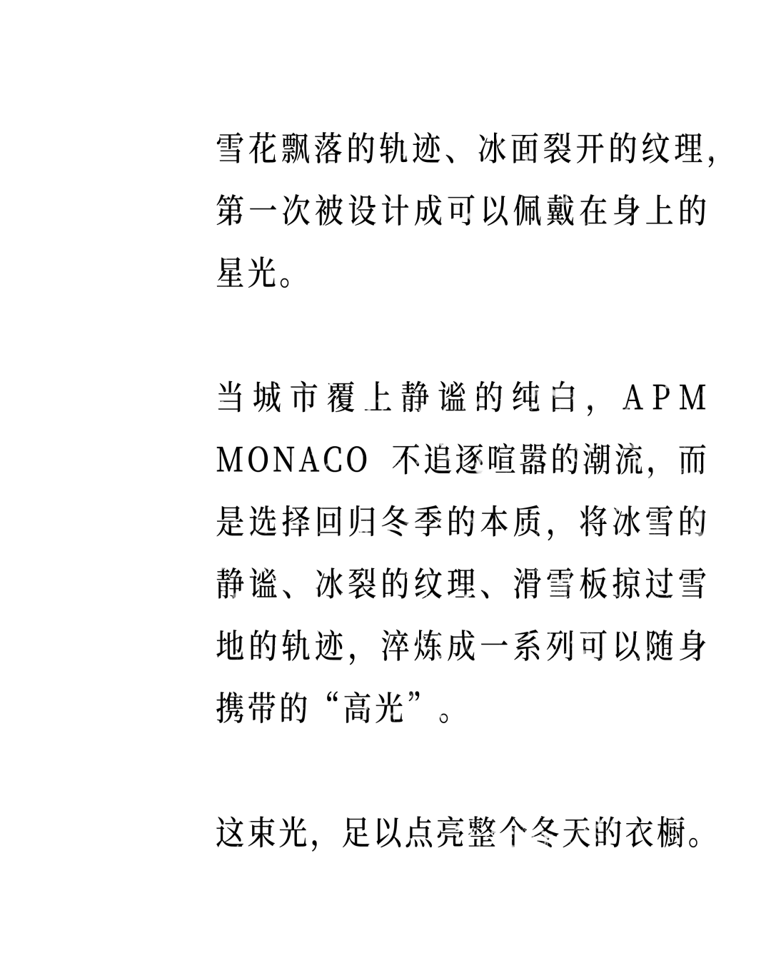 冬日的美,存在于动态的瞬间与静态的永恒之间,APM MONACO HIVER系列的灵感,便捕捉了这些稍纵即逝的诗意:滑冰鞋在冰面划出的流畅弧线,滑雪板在雪坡上留下的蜿蜒曲线。这些充满生命力的轨迹,与皑皑初雪的纯净、冰晶规则的几何结构、冰面天然的裂痕交织在一起。