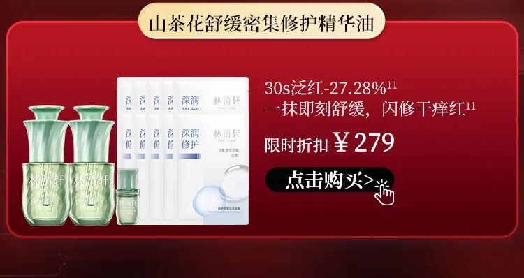 11.数据来源于第三方测试报告,基于31位26~45岁中国敏感皮肤受试者通过乳酸刺痛实验,使用林清轩山茶花舒缓密集修护精华油30秒后,通过皮肤科医生问询受试者面部皮肤主观感受,并对皮肤泛红、干痒等情况进行评分的结果,实际效果因人而异。