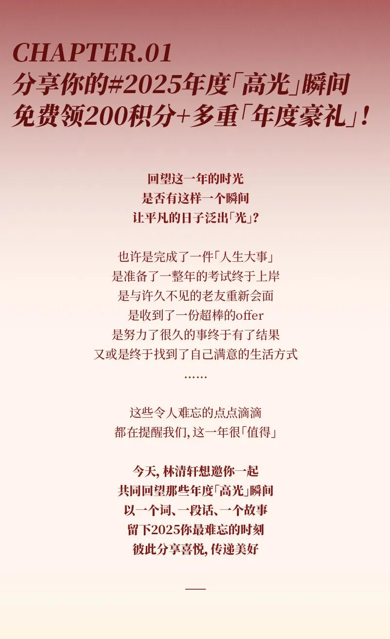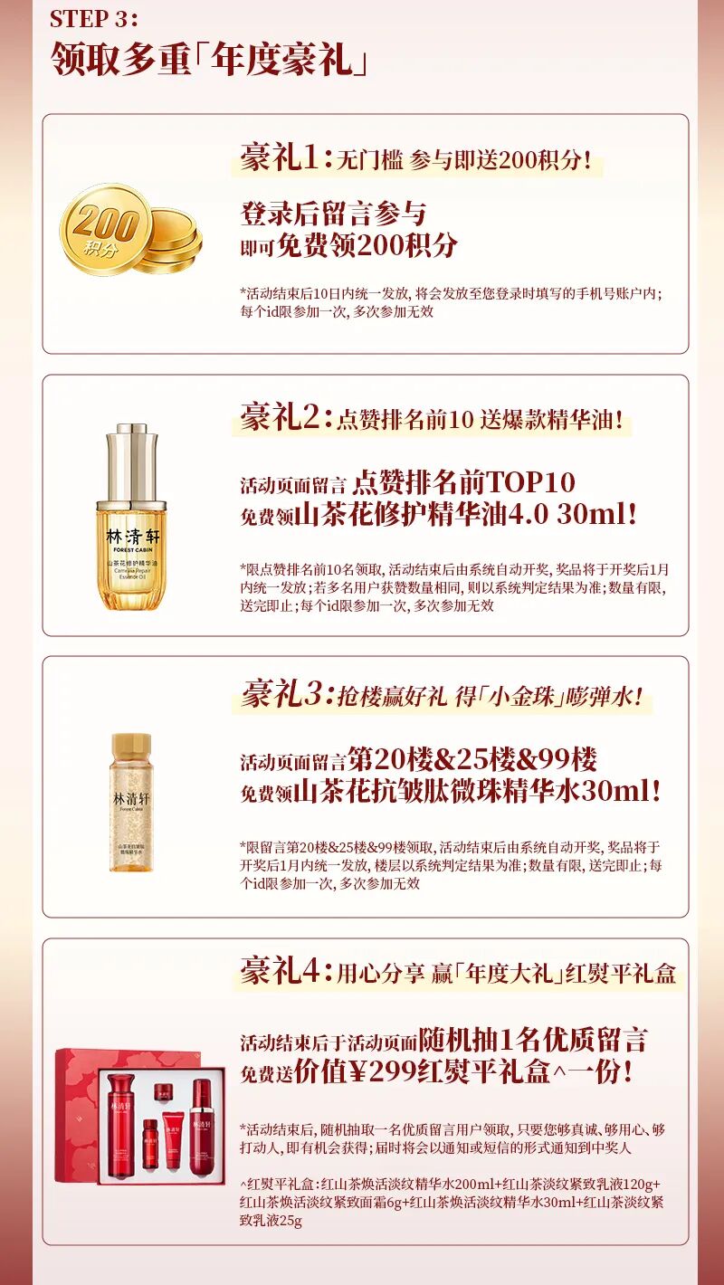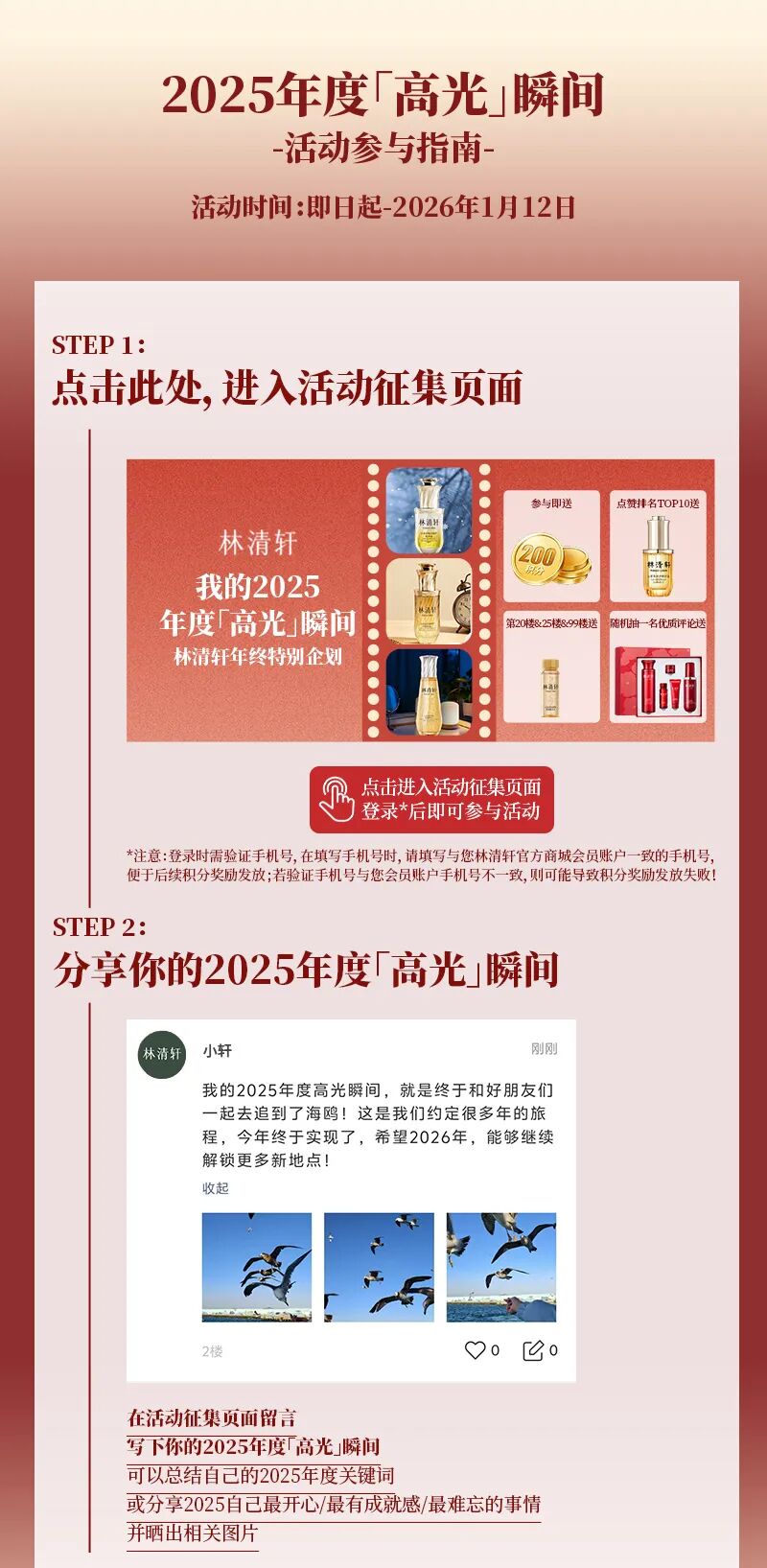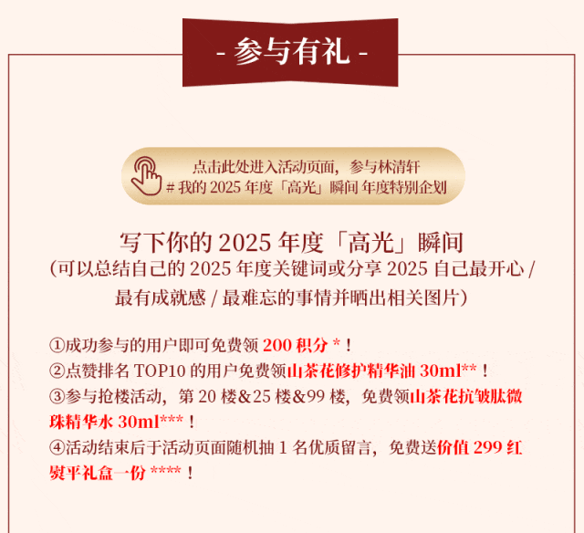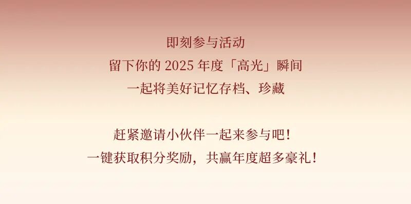 摘要:【互动有礼】分享你的2025年度「高光」瞬间,200积分、爆款精华油、爆款精华水、红熨平礼盒等超多惊喜福利等你来领!
