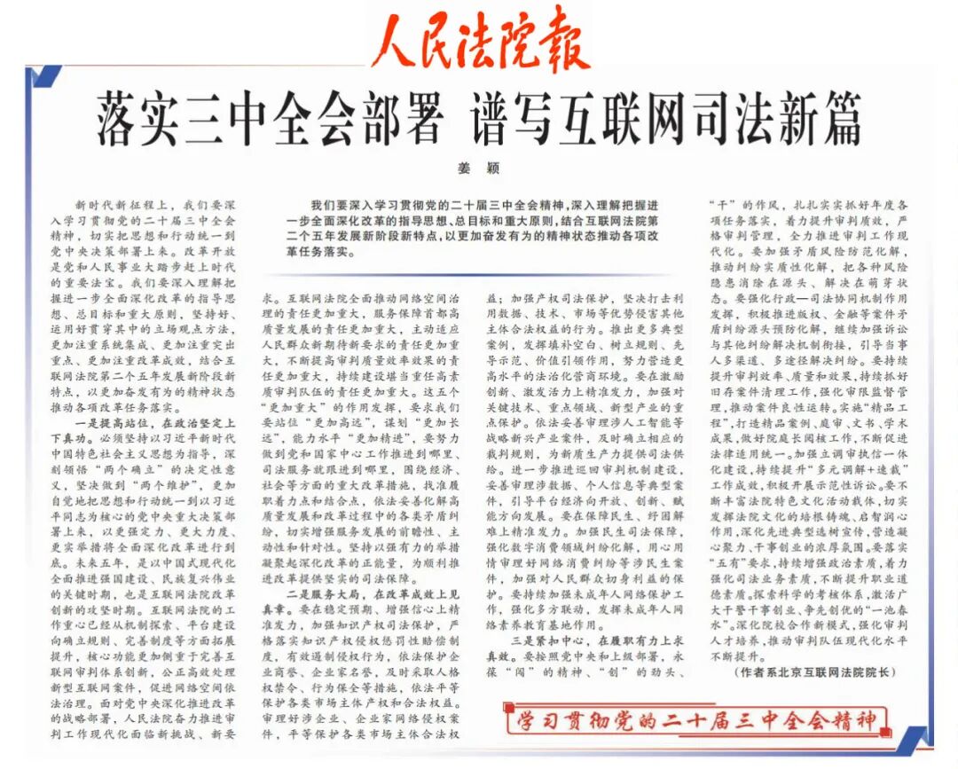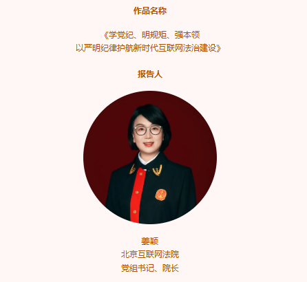 北京互联网法院党组书记、院长姜颖党课作品《学党纪、明规矩、强本领以严明纪律护航新时代互联网法治建设》荣获2024年度“宣讲家杯”优秀理论讲稿。
