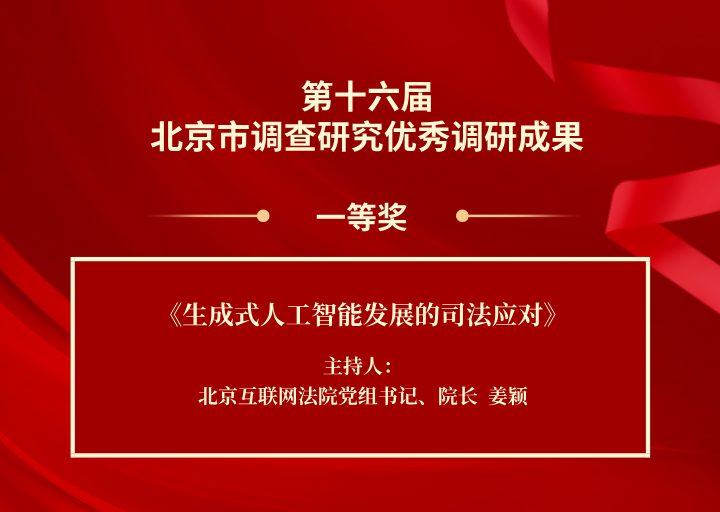 北京互联网法院党组书记、院长姜颖主持的课题《生成式人工智能发展的司法应对》获评第十六届北京市调查研究优秀调研成果一等奖,是北京法院唯一获评一等奖的课题。