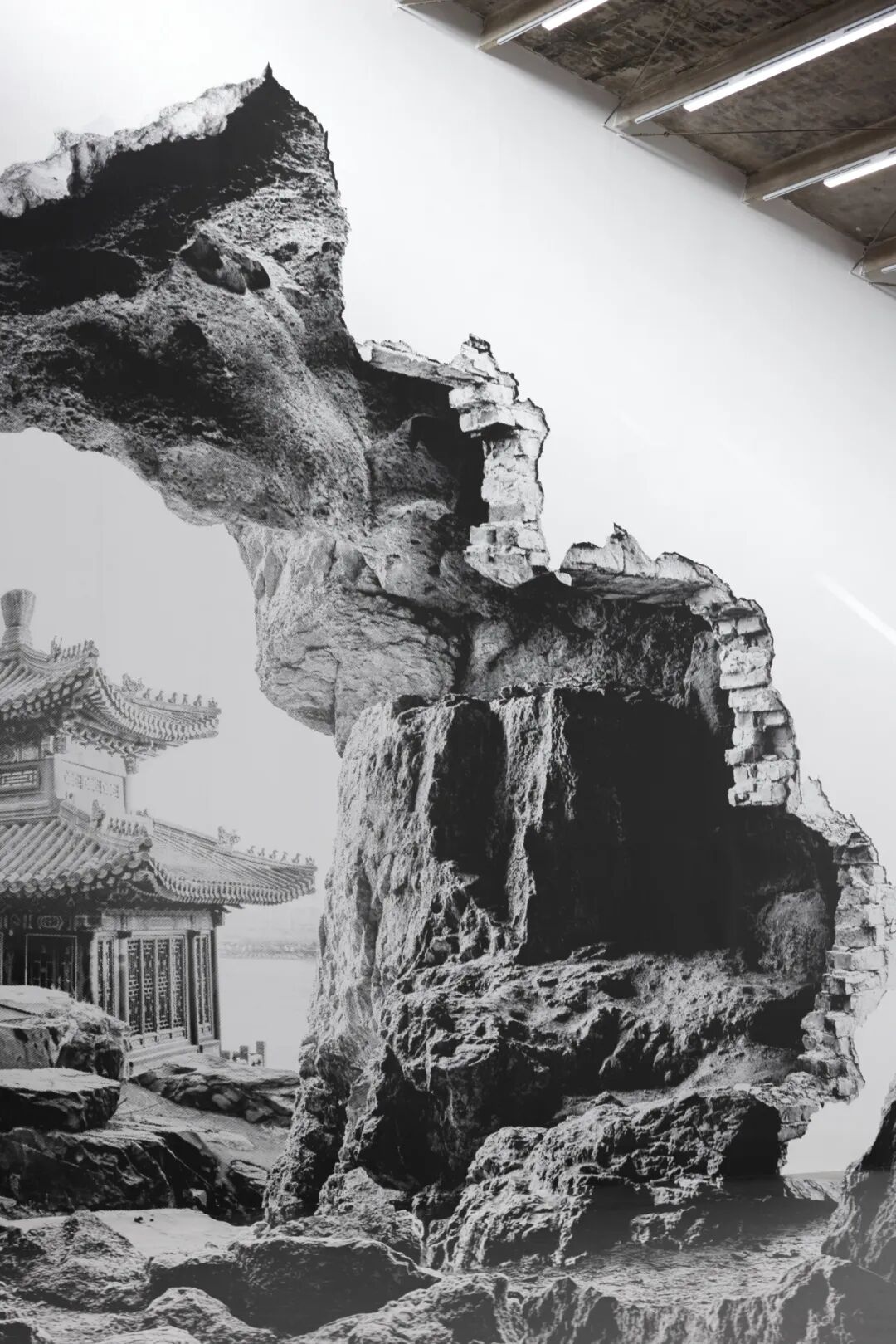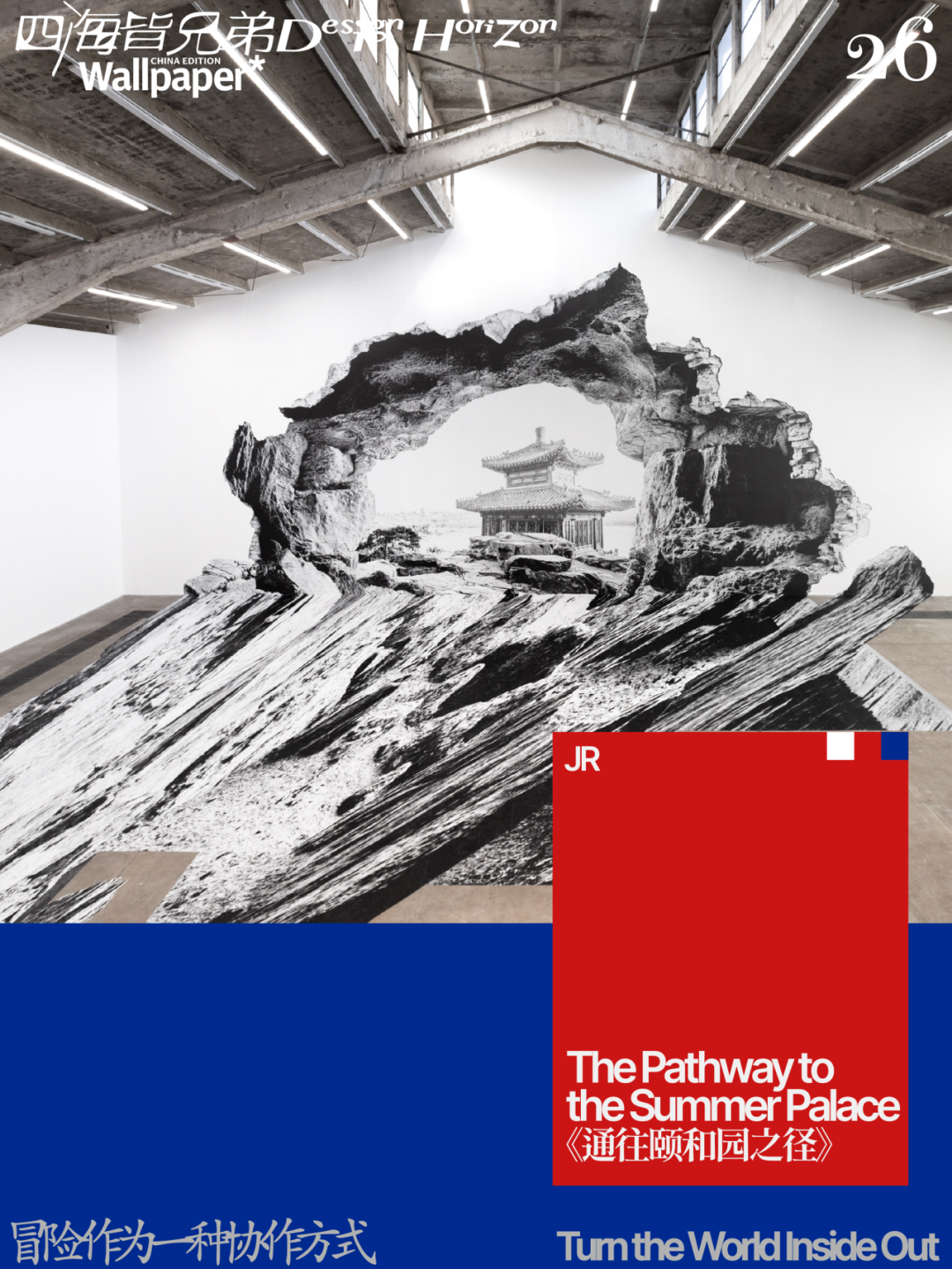 此次JR在北京常青画廊的个展“万花筒”,也是一次梳理和在地创作的结合。艺术家将其在世界各地建筑表面制造“伤口”的方法,运用到北京常青画廊空间中最大的一面室内墙体之上,使798的老工业厂房与275年前的颐和园凉亭展开了一场跨越时空的对话。核心装置作品《通往颐和园之径》通过空间的交叠与视错觉的方式,让观众在特定角度下仿佛“穿透”墙体,直视远处颐和园中的楼阁;而观者所面对的方向,正是现实中通往颐和园的地理方位。
