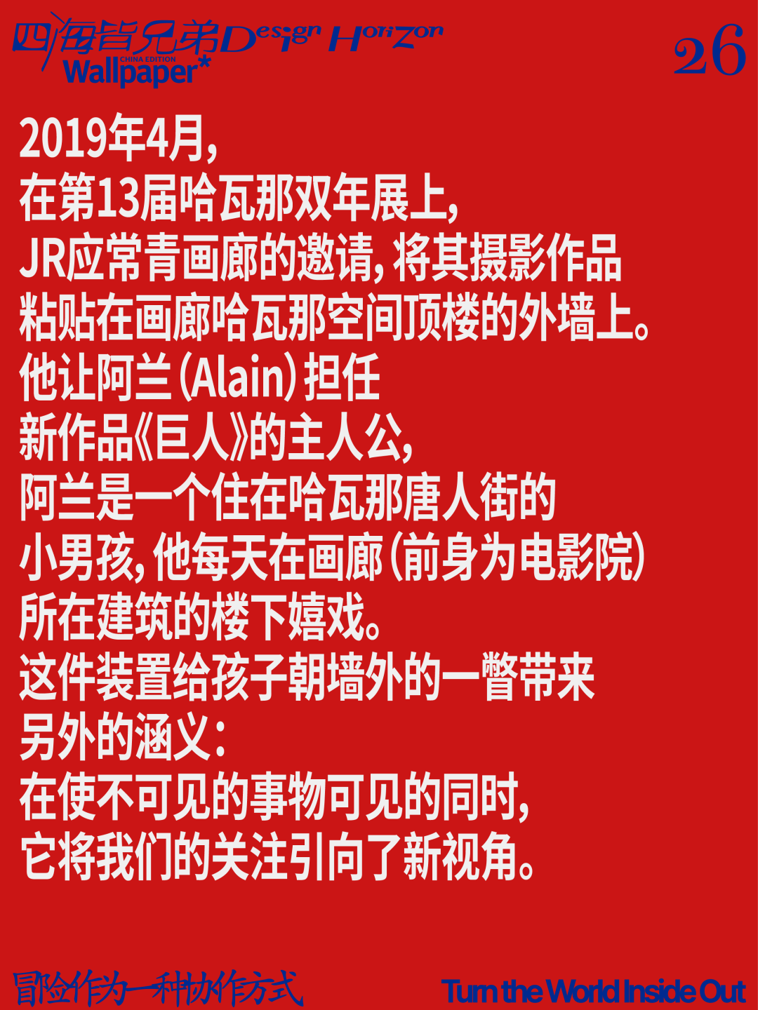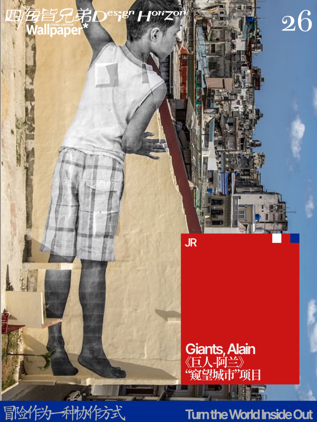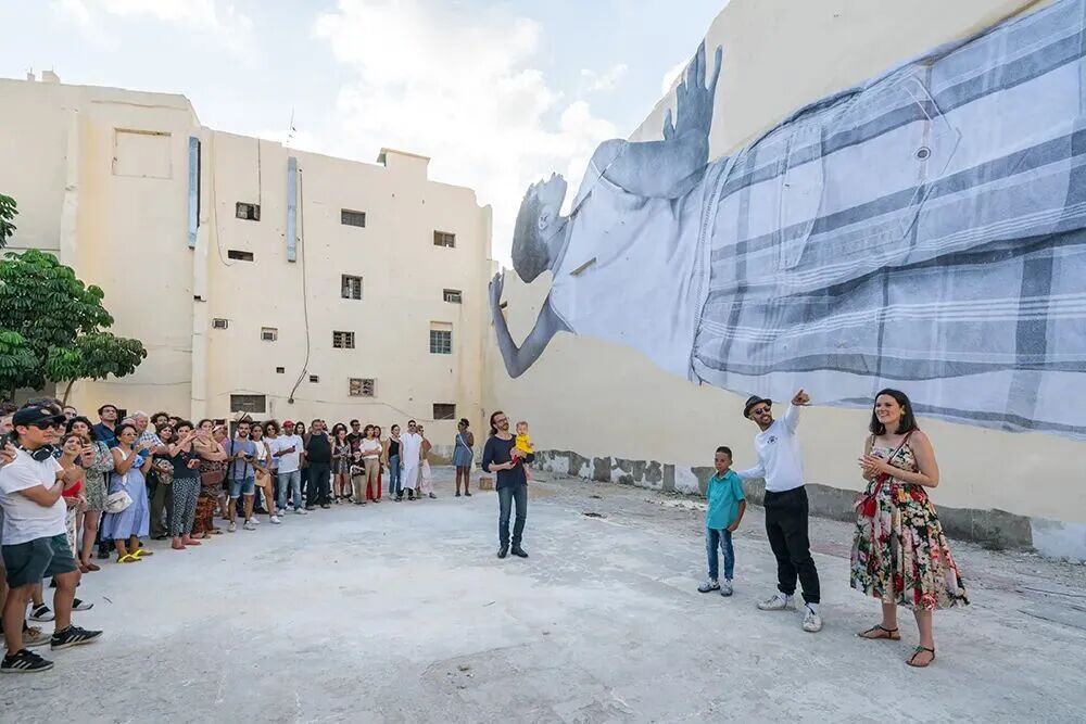 在这一系列实践中,Lorenzo的角色不仅是组织者或支持者,也逐渐成为JR艺术冒险的共同协作者。他们的第一次正式合作发生在古巴哈瓦那常青画廊——唐人街旧电影院背后的一面墙上。项目“窥望城市”(Peeking at the City)的灵感,源于Lorenzo向JR介绍画廊及其周边环境的过程。JR与住在画廊对面的当地孩子及其家人一起,将一张高达30米的小男孩肖像贴在墙面上,男孩的目光越过哈瓦那的城市天际线,指向另一端的迈阿密。开幕当日,朋友们在居民家中穿梭庆祝,作品自然融入当地的日常生活之中。这也是Lorenzo欣赏JR作品的原因之一,它们总是以一种平等的方式链接着社区。