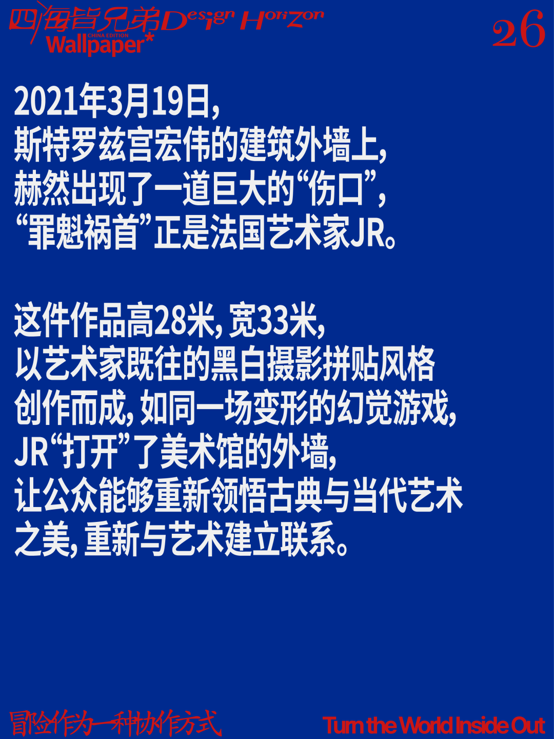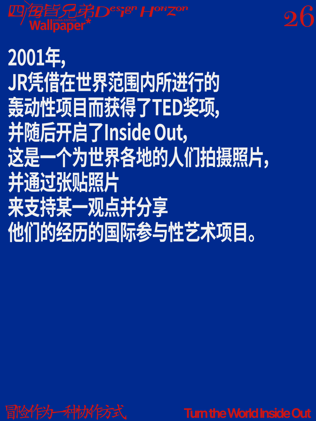 JR的作品结合了摄影、装置和电影,他将公共空间转化为“开放式”画廊,激发人们的思考和集体参与。