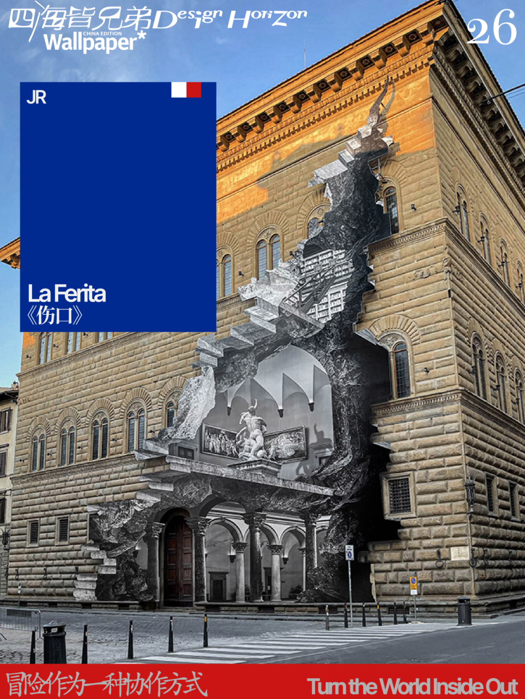 这种以“伤口”隐喻历史创伤的方式,在JR于佛罗伦萨斯特罗齐宫完成的项目《伤口》中得到了集中呈现。JR以一道巨大的裂口覆盖文艺复兴建筑的立面,将宫殿内部的空间“暴露”于公众视野之中,呈现出佛罗伦萨最具代表性的艺术作品。斯特罗齐宫在此从一个关停机构化为一个宏伟的舞台,呈现出一处象征性却又带有痛感的“伤口”,象征着疫情期间意大利乃至全球文化机构共同的创伤——博物馆、图书馆与剧院的关闭和限制入场。